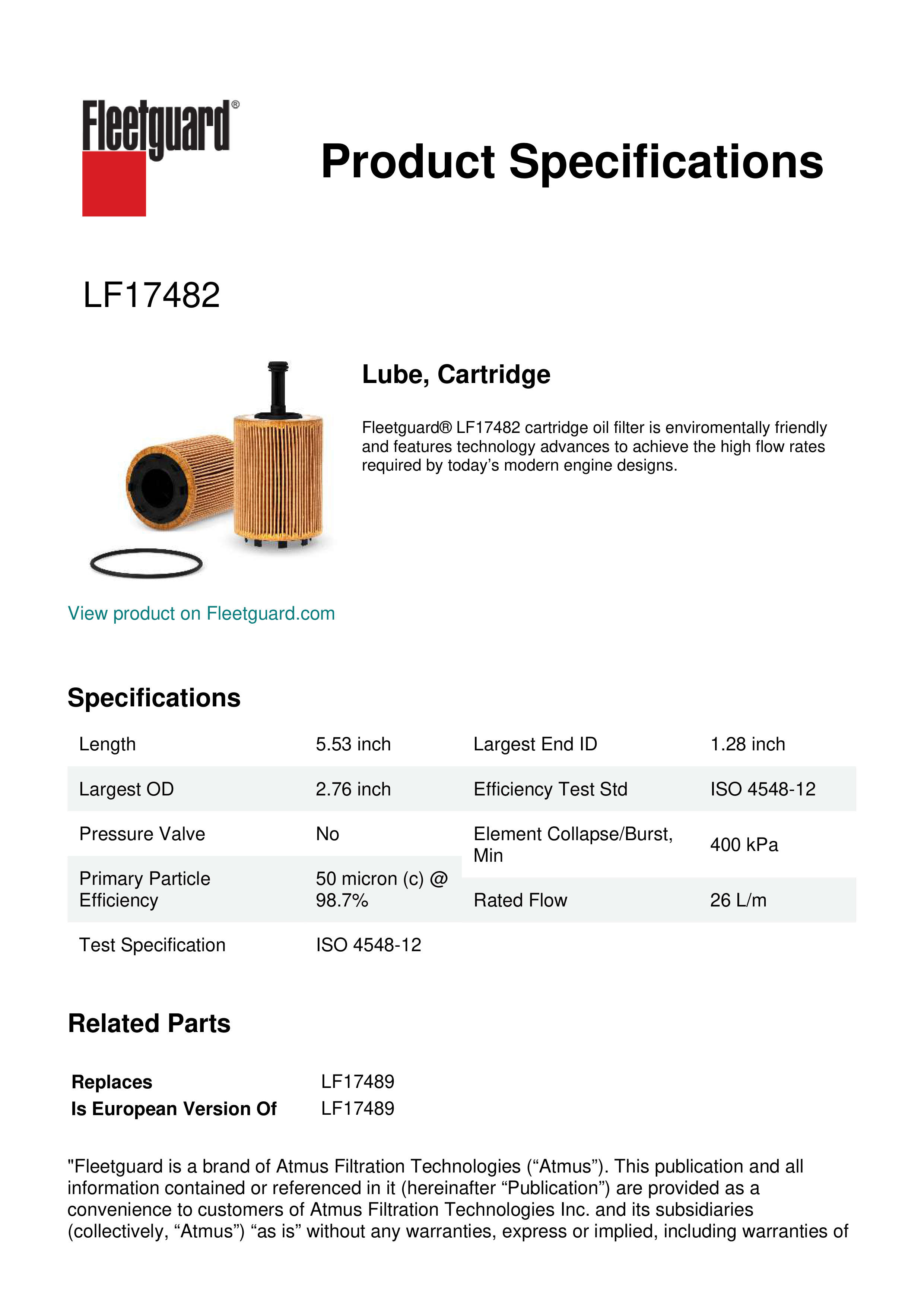 Fleetguard® LF17482 cartridge oil filter is enviromentally friendly and features technology advances to achieve the high flow rates required by today’s modern engine designs.Specification