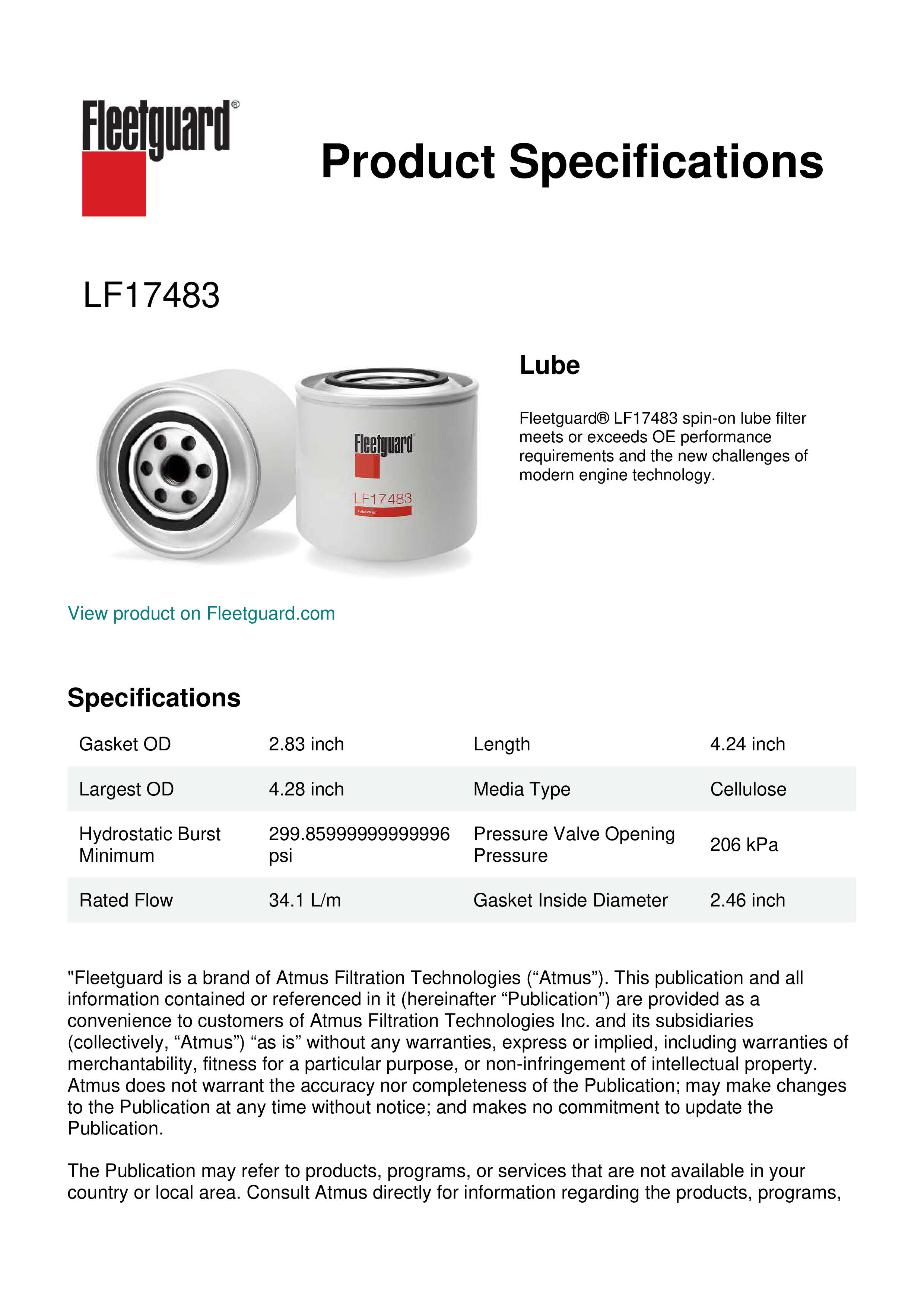 Fleetguard® LF17483 spin-on lube filter meets or exceeds OE performance requirements and the new challenges of modern engine technology.Specification