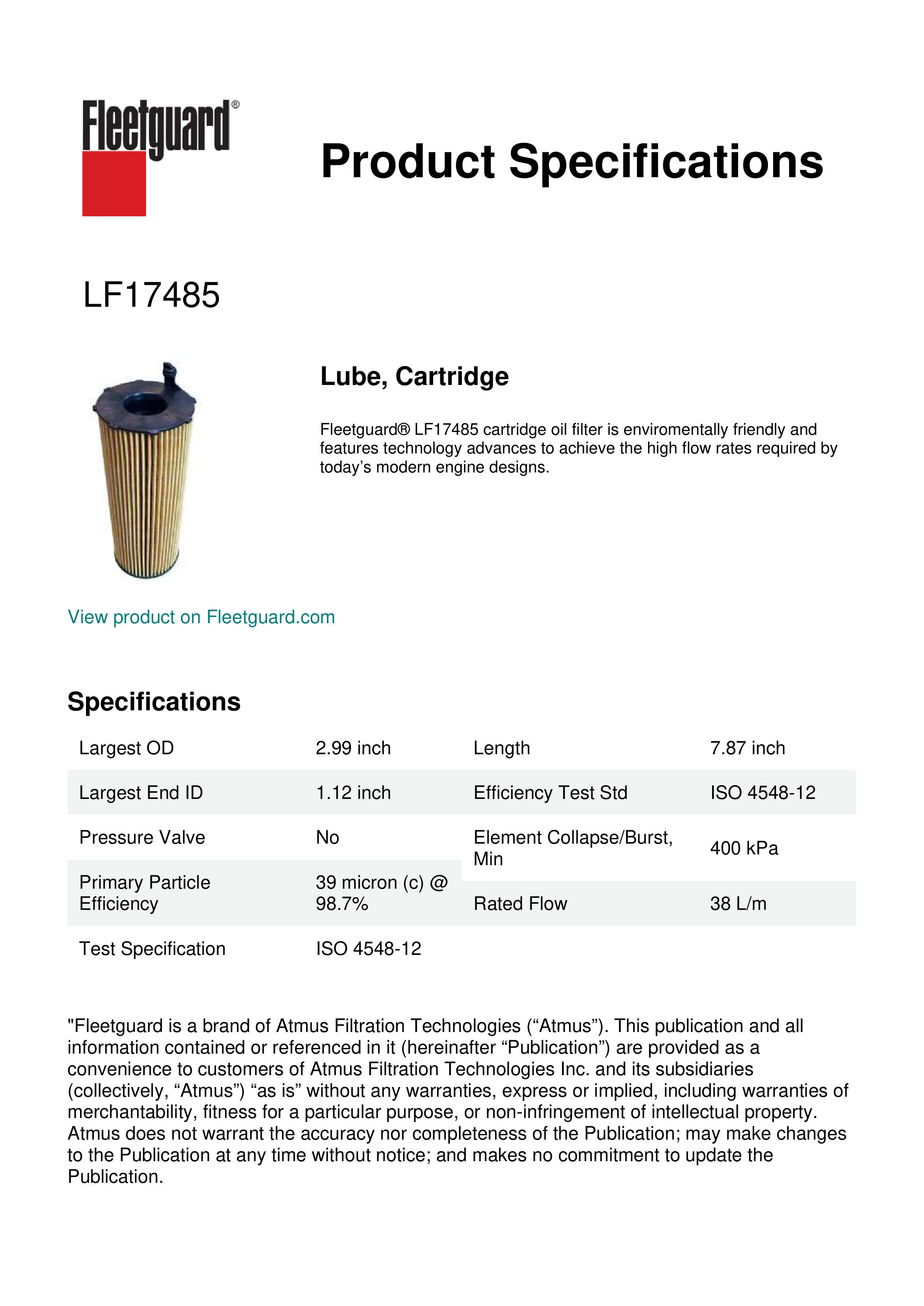 Fleetguard® LF17485 cartridge oil filter is enviromentally friendly and features technology advances to achieve the high flow rates required by today’s modern engine designs.Specification