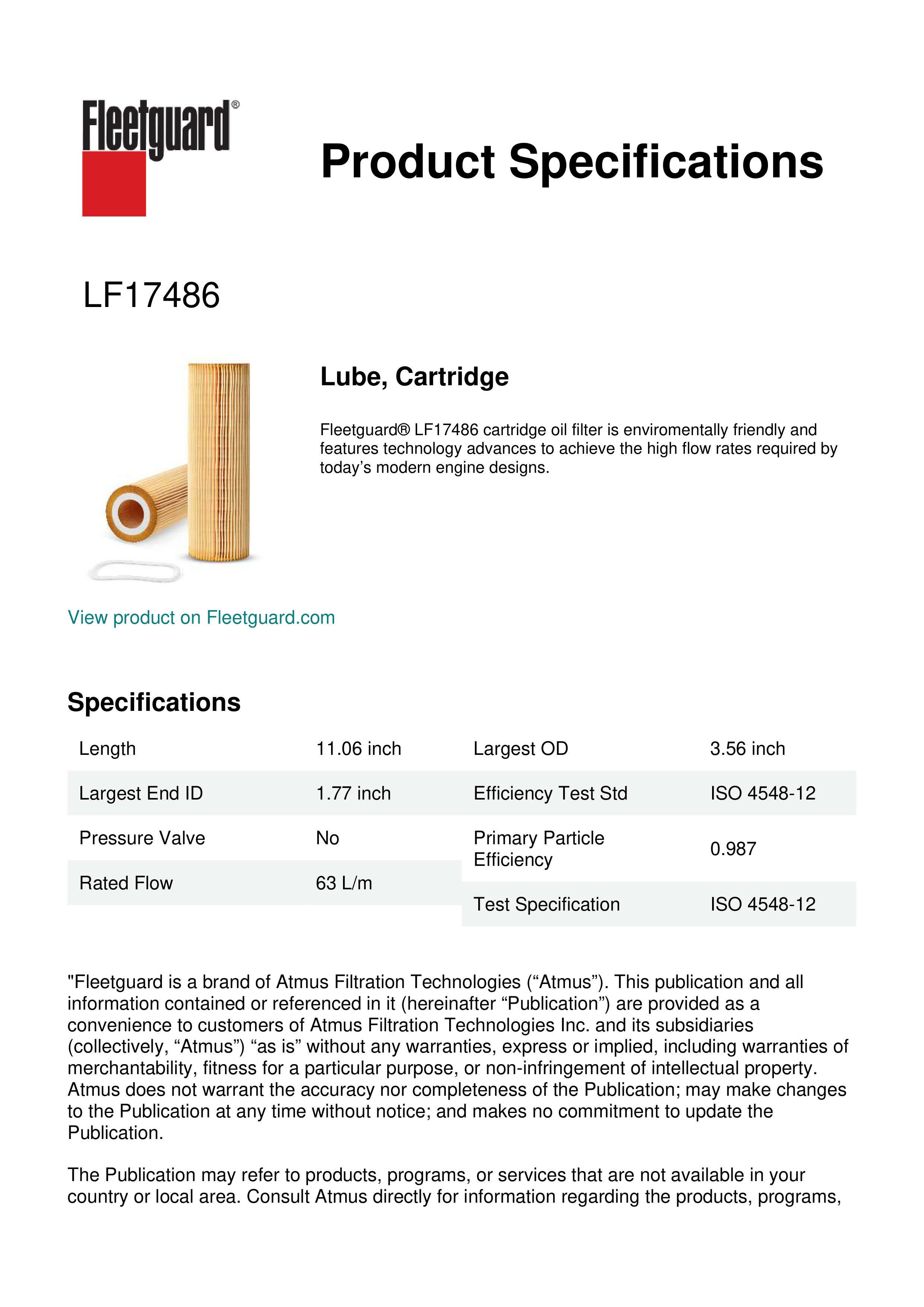 Fleetguard® LF17486 cartridge oil filter is enviromentally friendly and features technology advances to achieve the high flow rates required by today’s modern engine designs.Specification