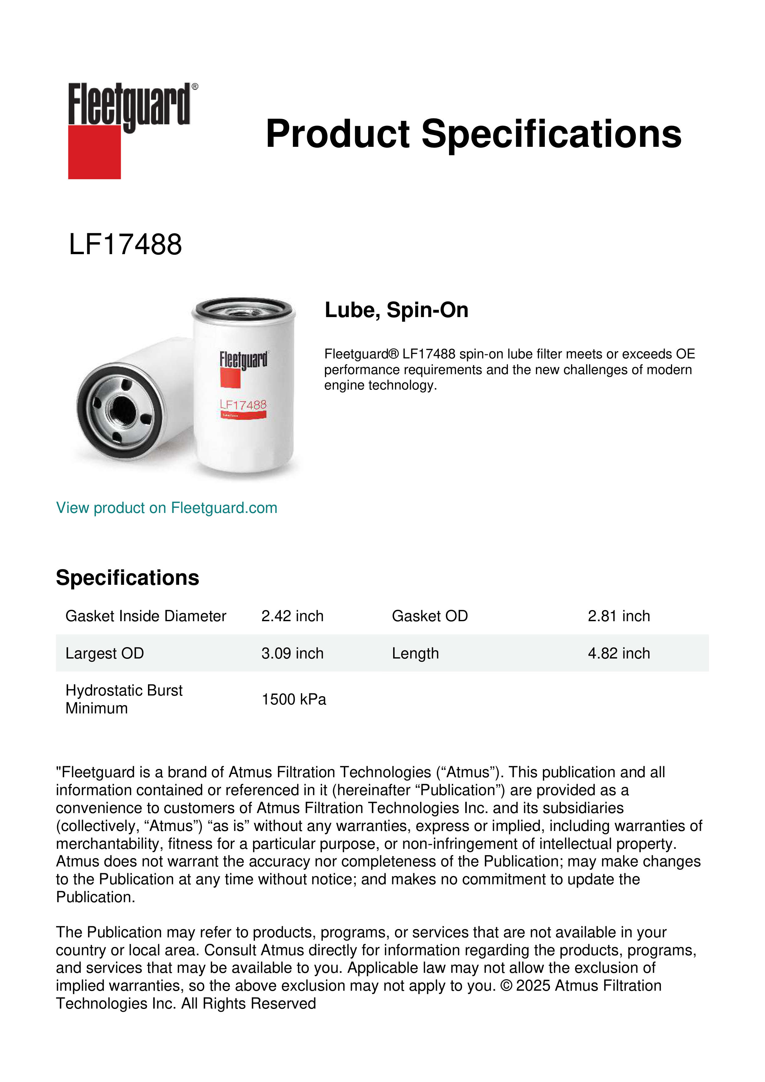 Fleetguard® LF17488 spin-on lube filter meets or exceeds OE performance requirements and the new challenges of modern engine technology.Specification