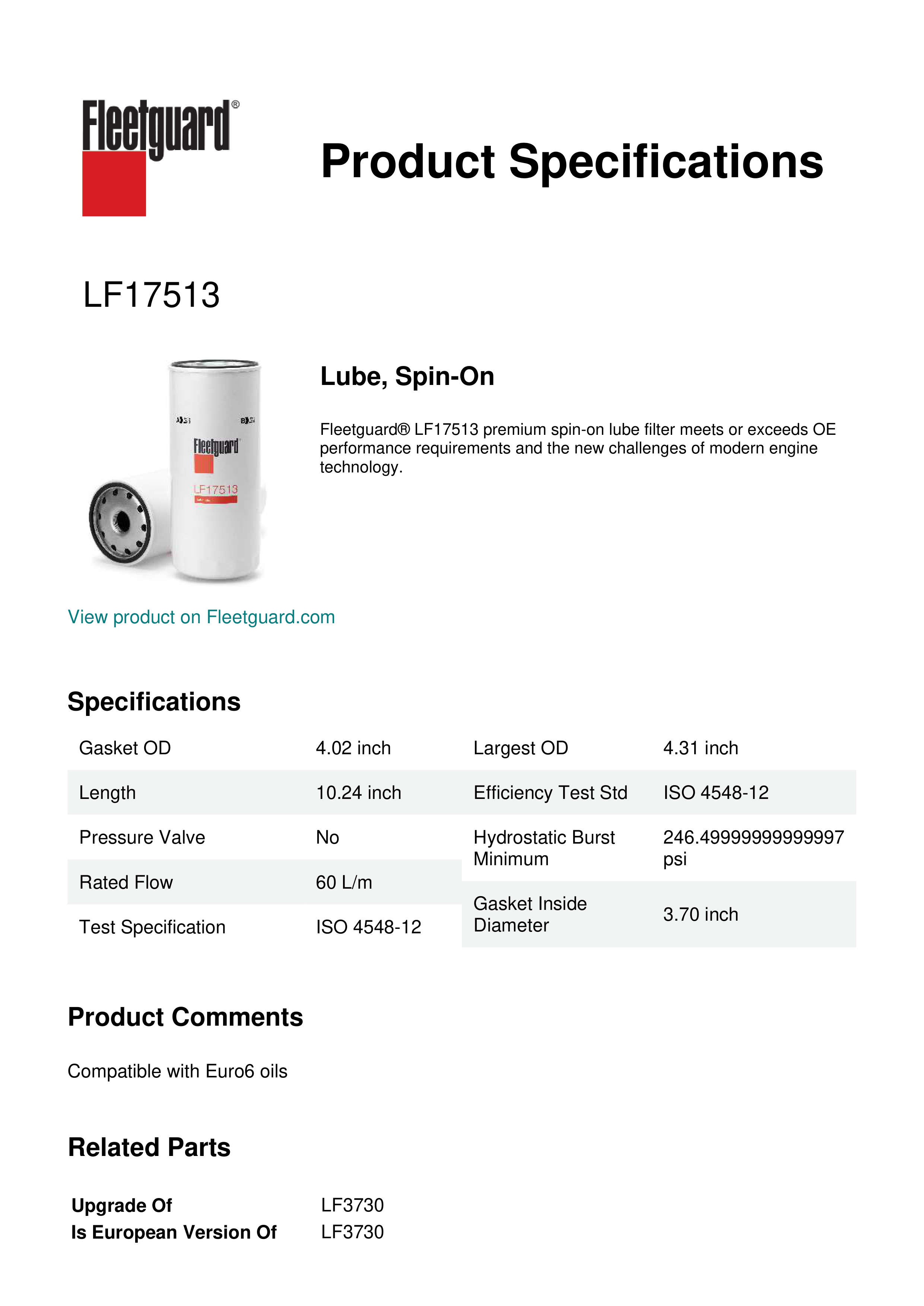 Fleetguard® LF17513 premium spin-on lube filter meets or exceeds OE performance requirements and the new challenges of modern engine technology.Specification