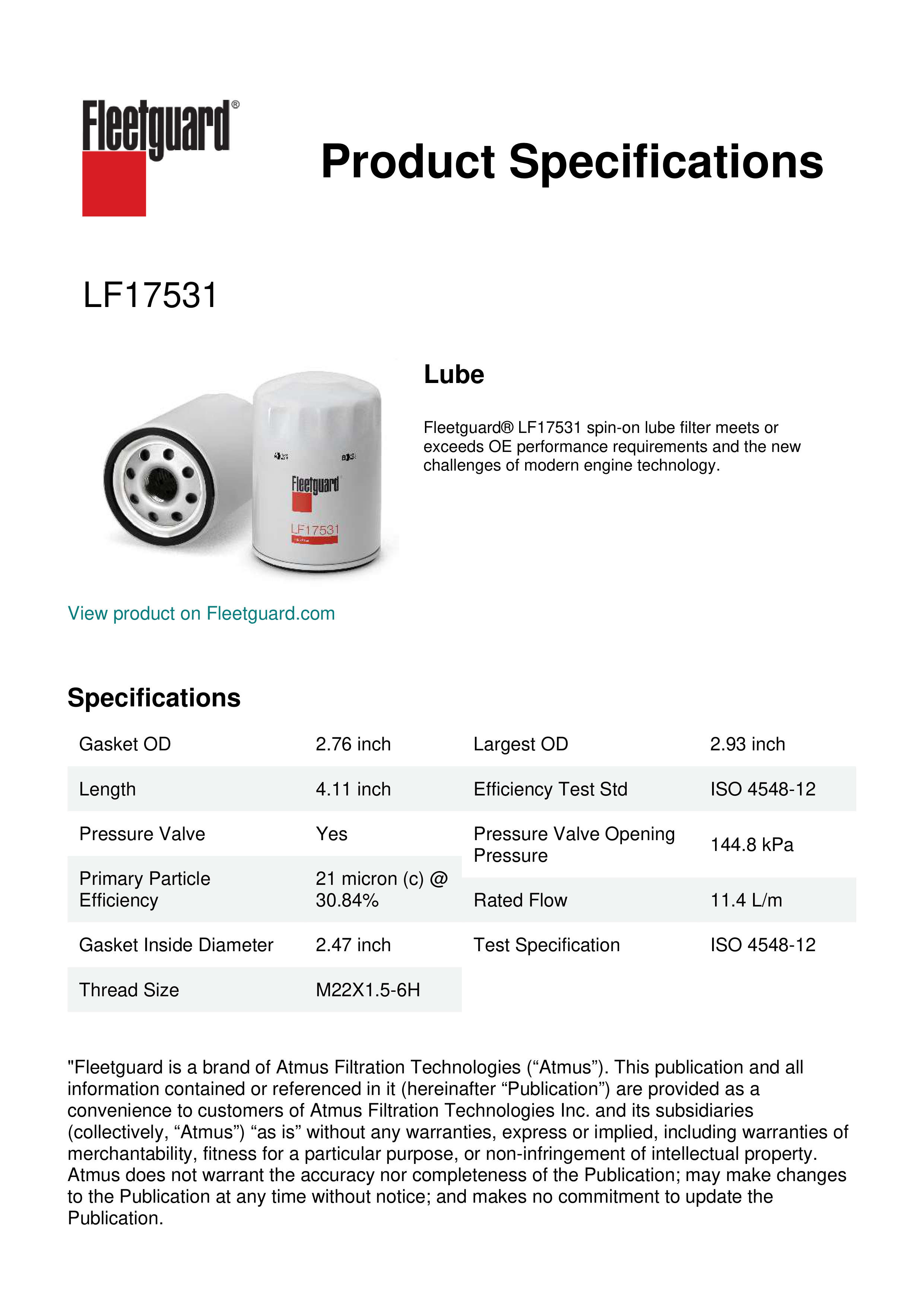 Fleetguard® LF17531 spin-on lube filter meets or exceeds OE performance requirements and the new challenges of modern engine technology.Specification