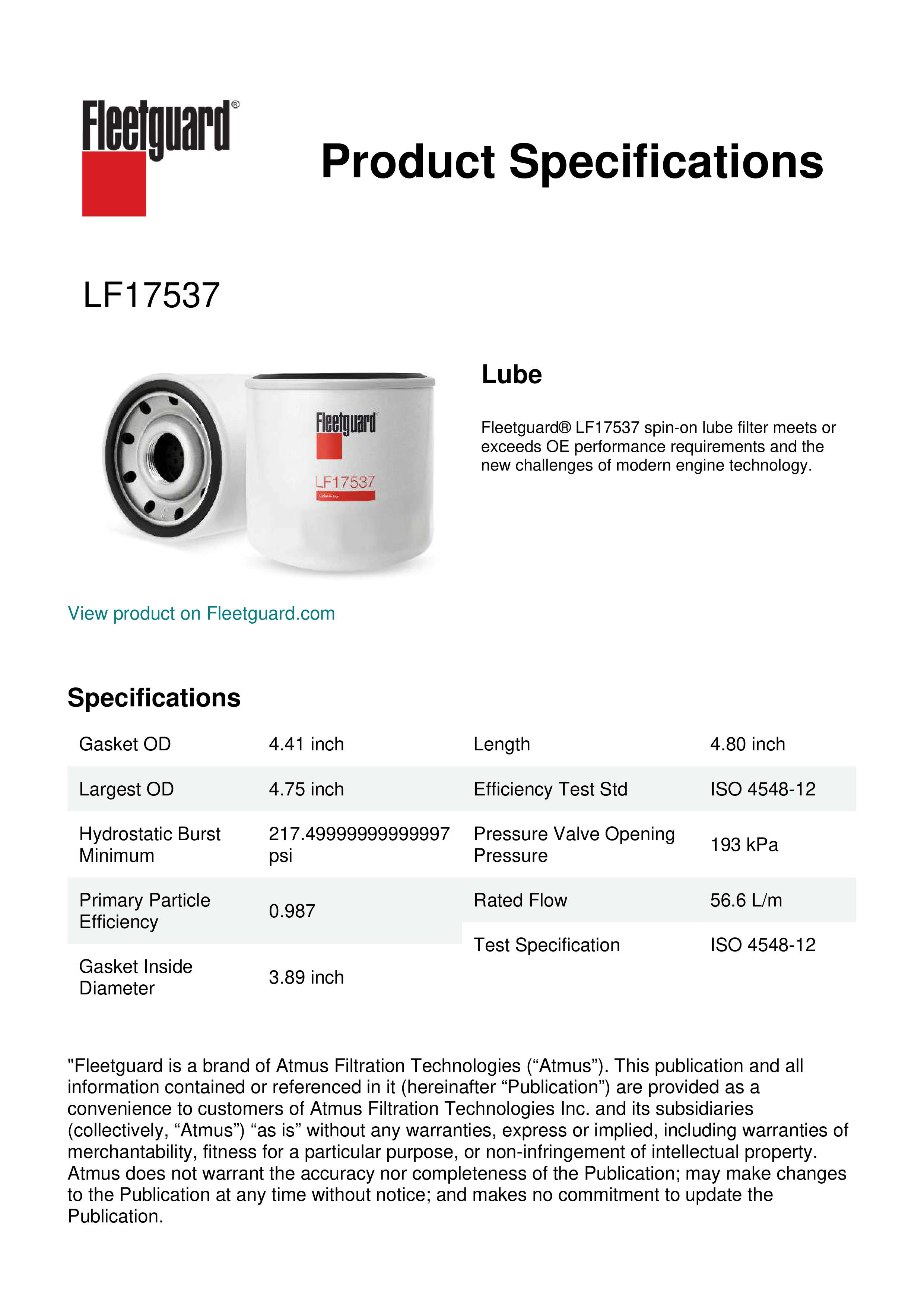 Fleetguard® LF17537 spin-on lube filter meets or exceeds OE performance requirements and the new challenges of modern engine technology.Specification