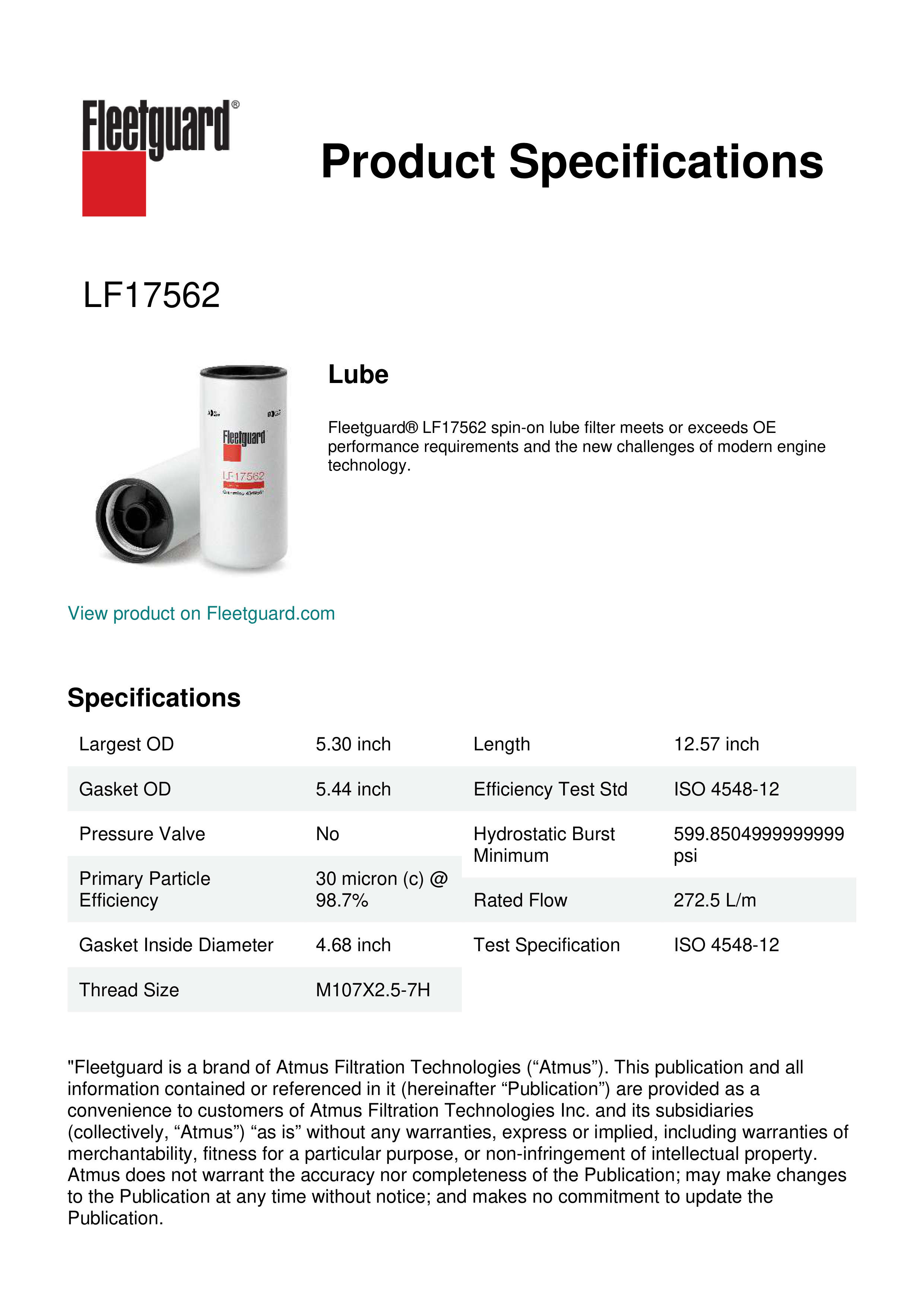 Fleetguard® LF17562 spin-on lube filter meets or exceeds OE performance requirements and the new challenges of modern engine technology.Specification