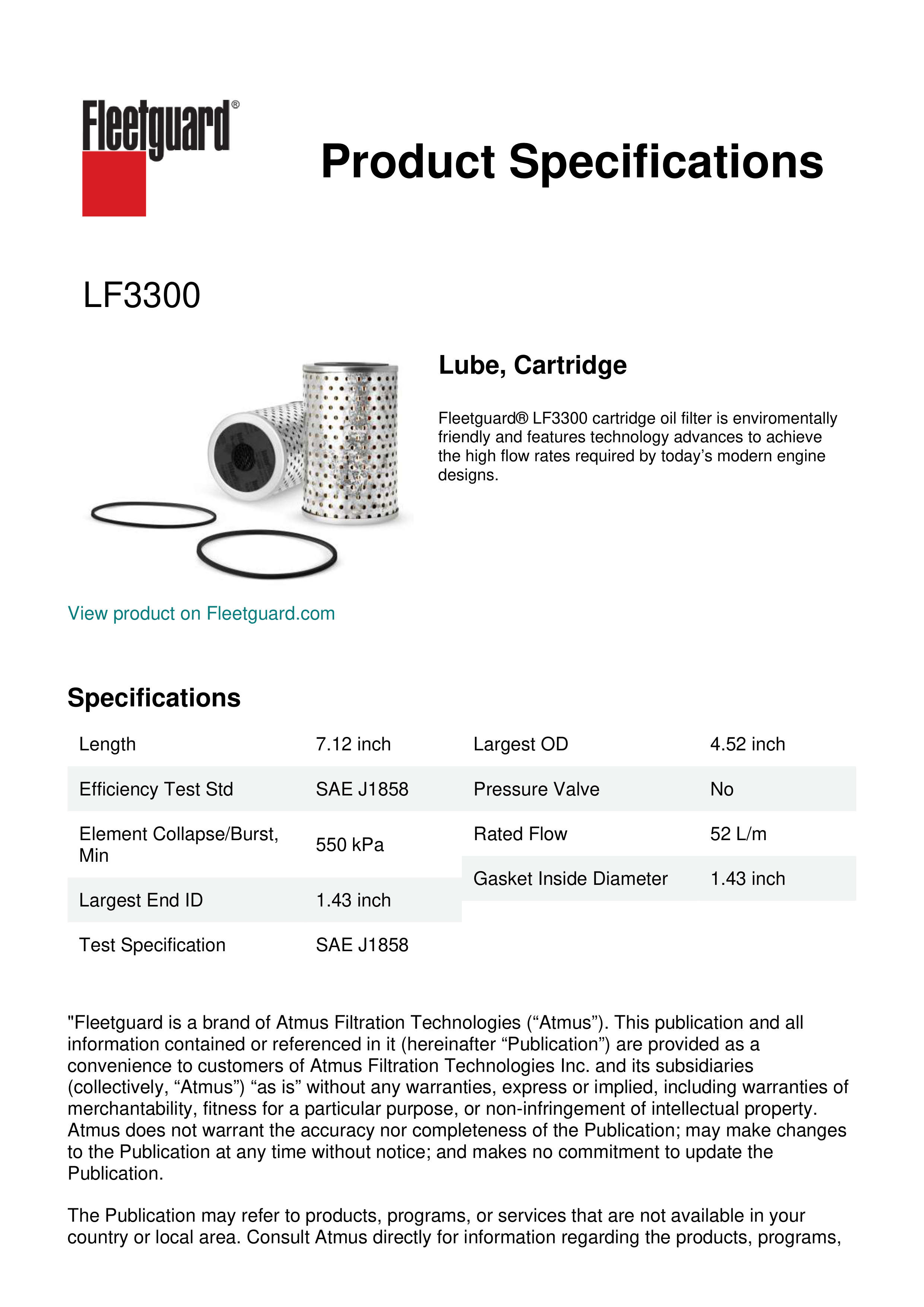 Fleetguard® LF3300 cartridge oil filter is enviromentally friendly and features technology advances to achieve the high flow rates required by today’s modern engine designs.Specification