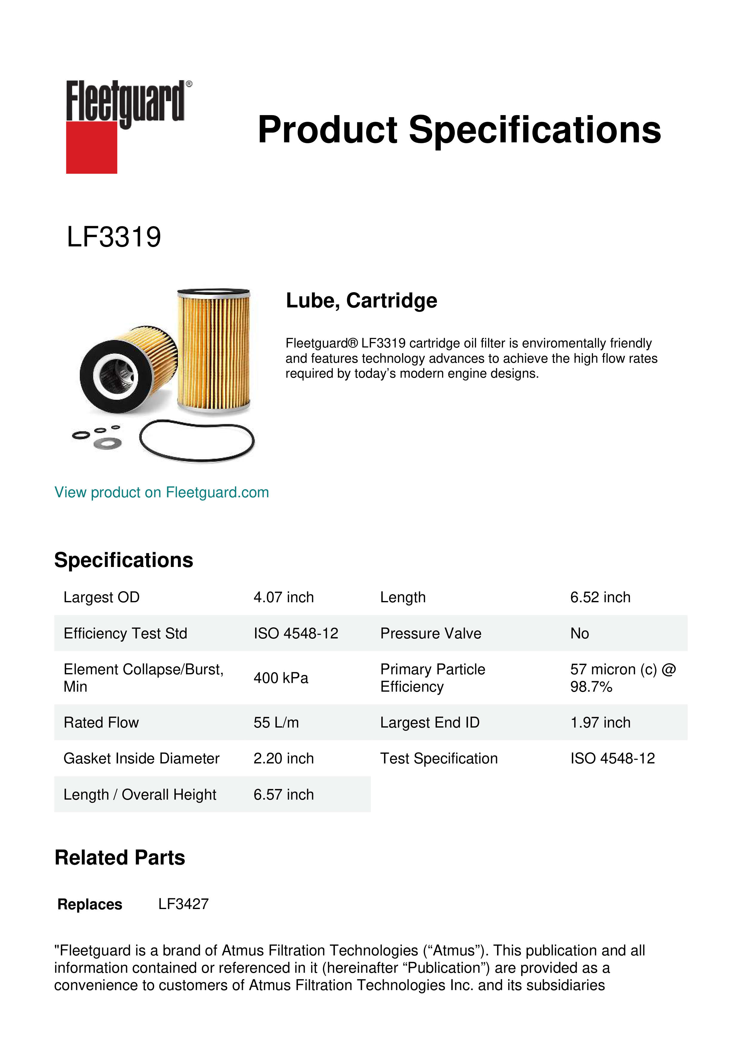 Fleetguard® LF3319 cartridge oil filter is enviromentally friendly and features technology advances to achieve the high flow rates required by today’s modern engine designs.Specification