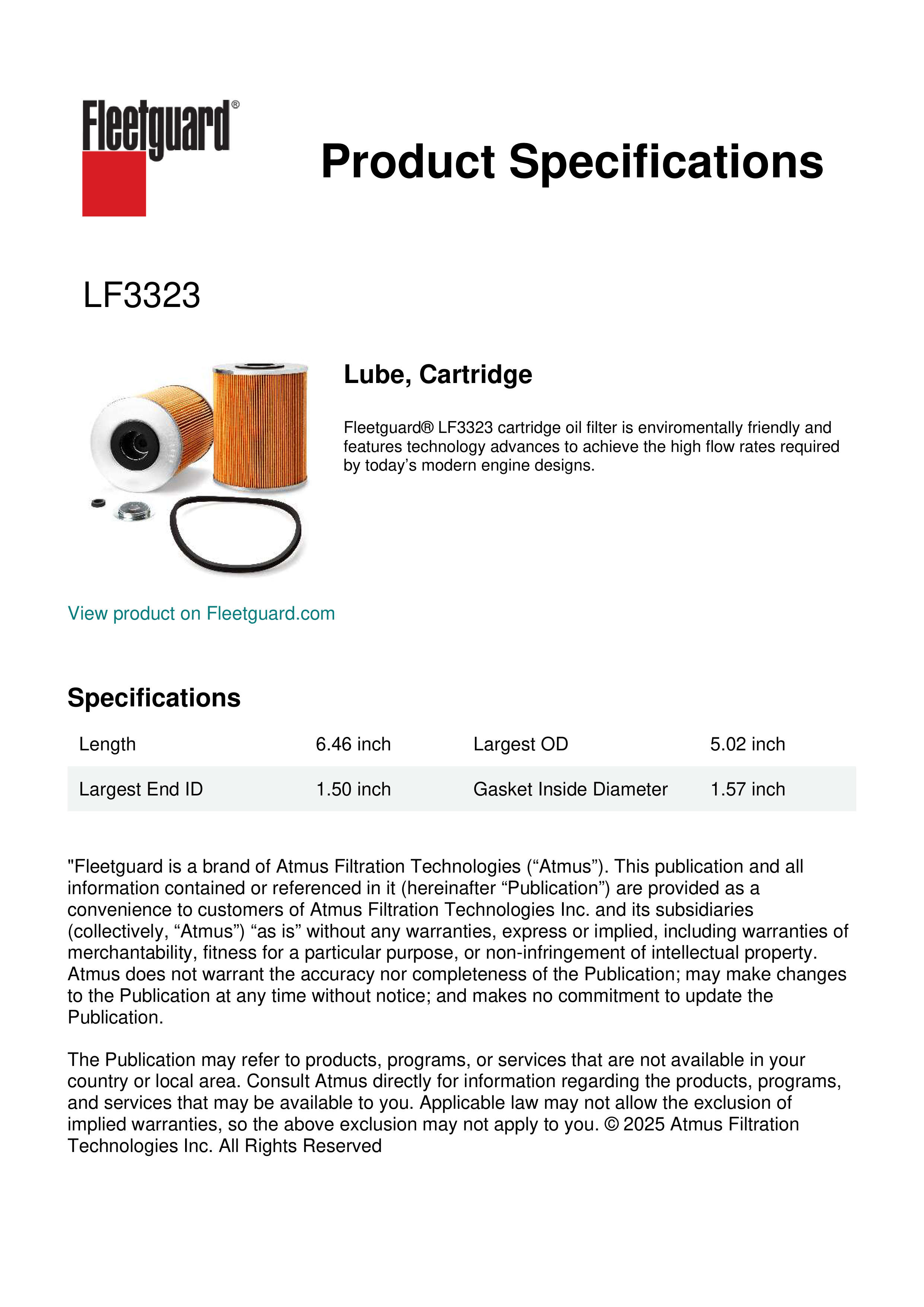 Fleetguard® LF3323 cartridge oil filter is enviromentally friendly and features technology advances to achieve the high flow rates required by today’s modern engine designs.Specification