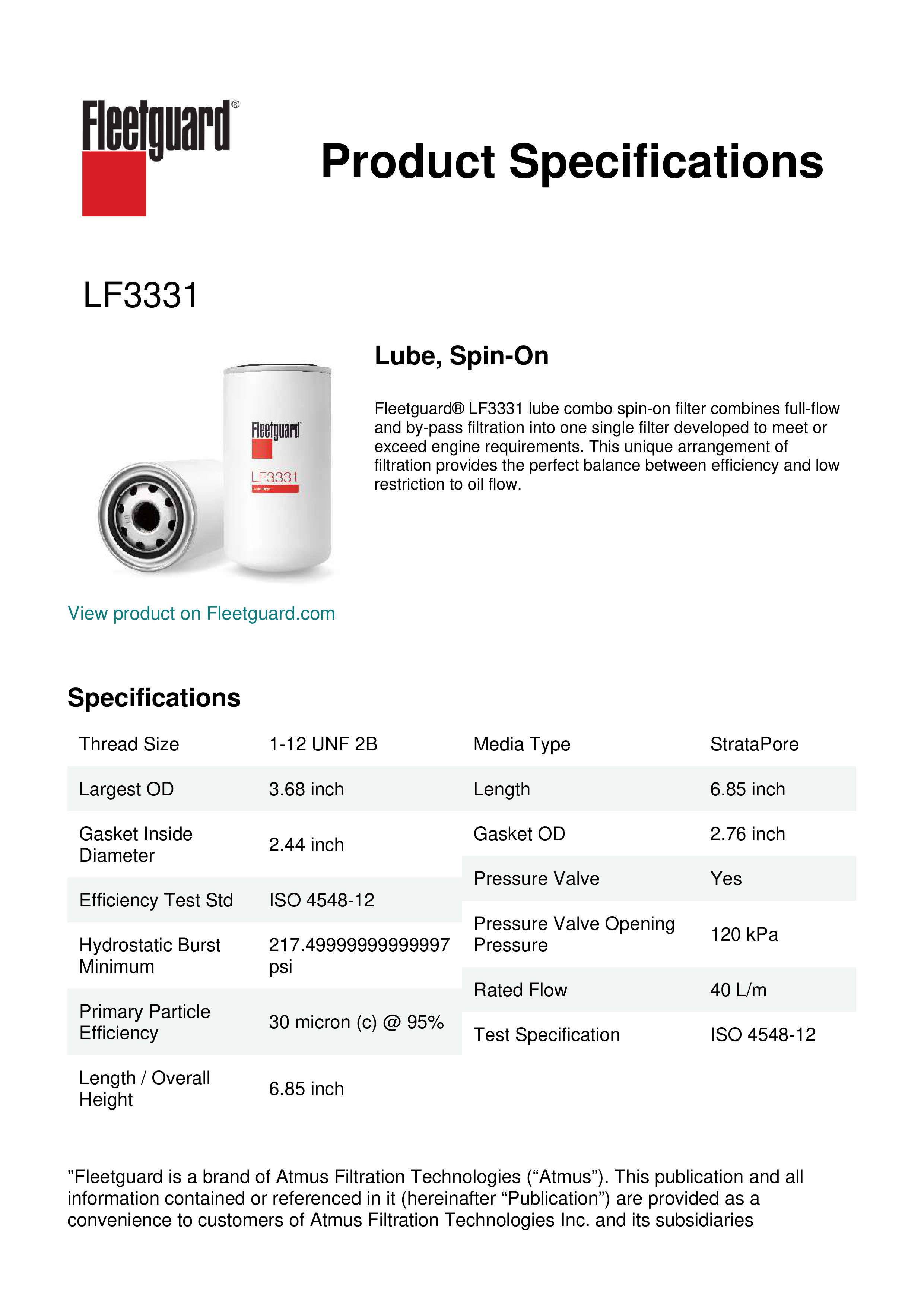 Fleetguard® LF3331 lube combo spin-on filter combines full-flow and by-pass filtration into one single filter developed to meet or exceed engine requirements. This unique arrangement of filtration provides the perfect balance between efficiency and low restriction to oil flow.Specification
