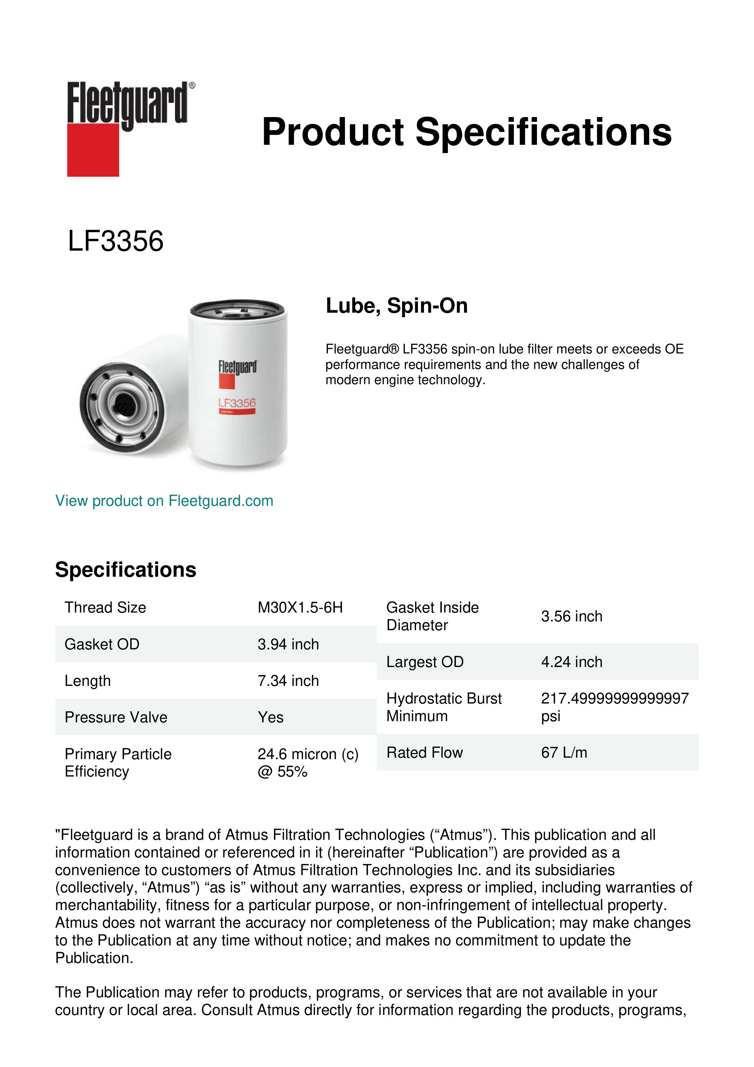 Fleetguard® LF3356 spin-on lube filter meets or exceeds OE performance requirements and the new challenges of modern engine technology.Specification