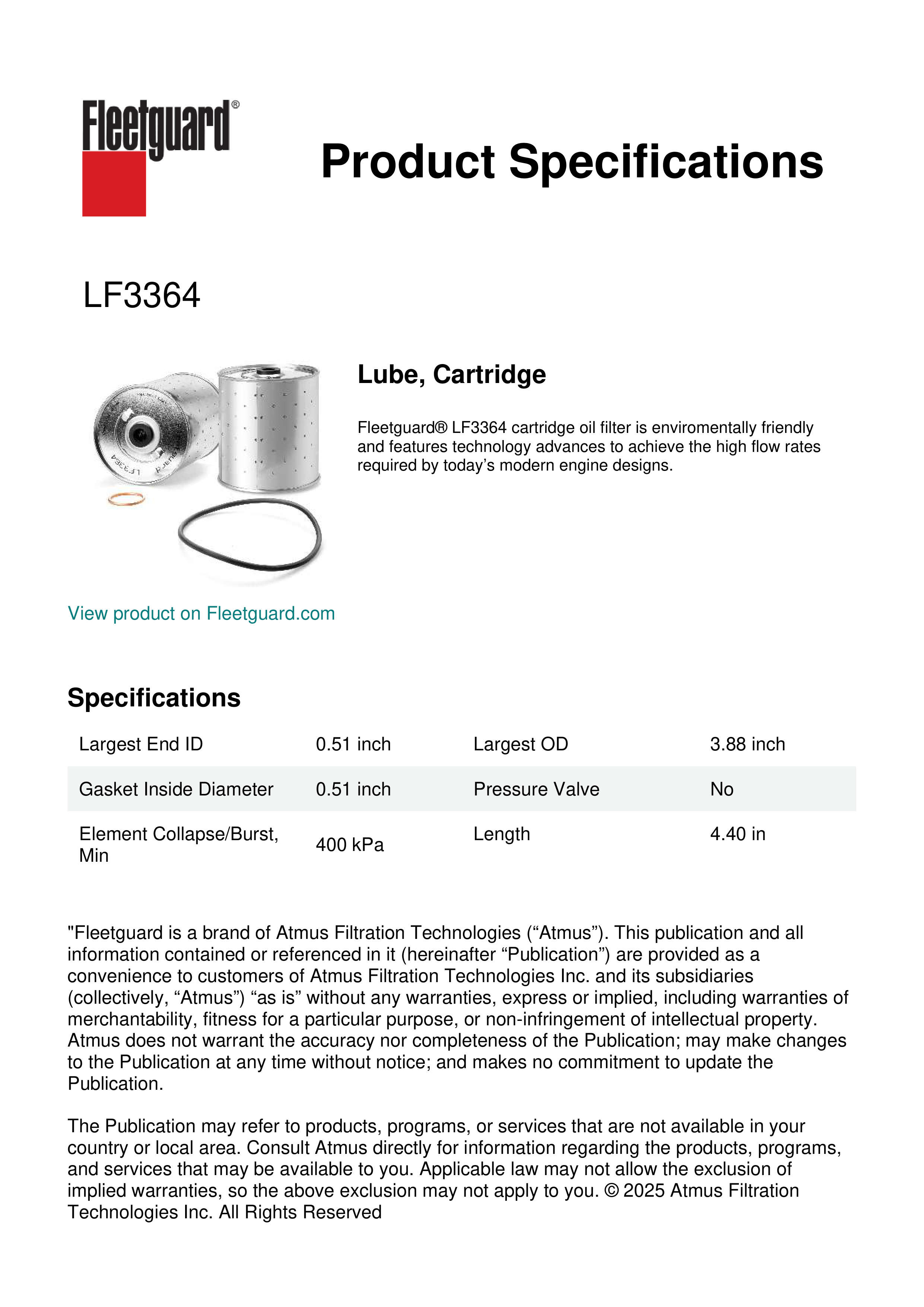 Fleetguard® LF3364 cartridge oil filter is enviromentally friendly and features technology advances to achieve the high flow rates required by today’s modern engine designs.Specification