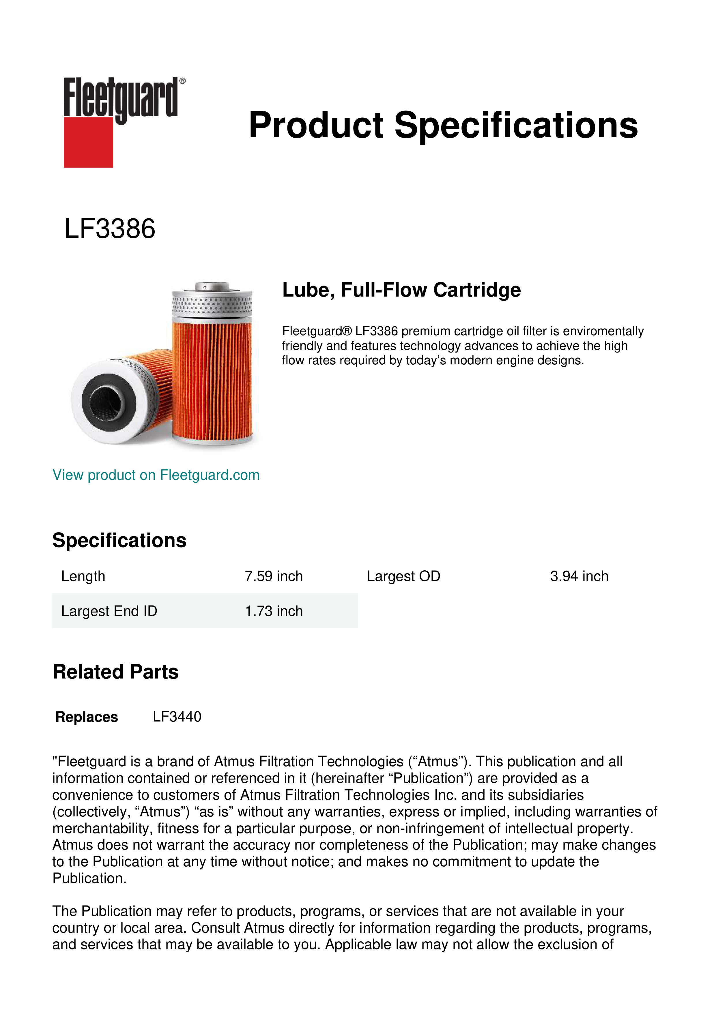 Fleetguard® LF3386 premium cartridge oil filter is enviromentally friendly and features technology advances to achieve the high flow rates required by today’s modern engine designs.Specification