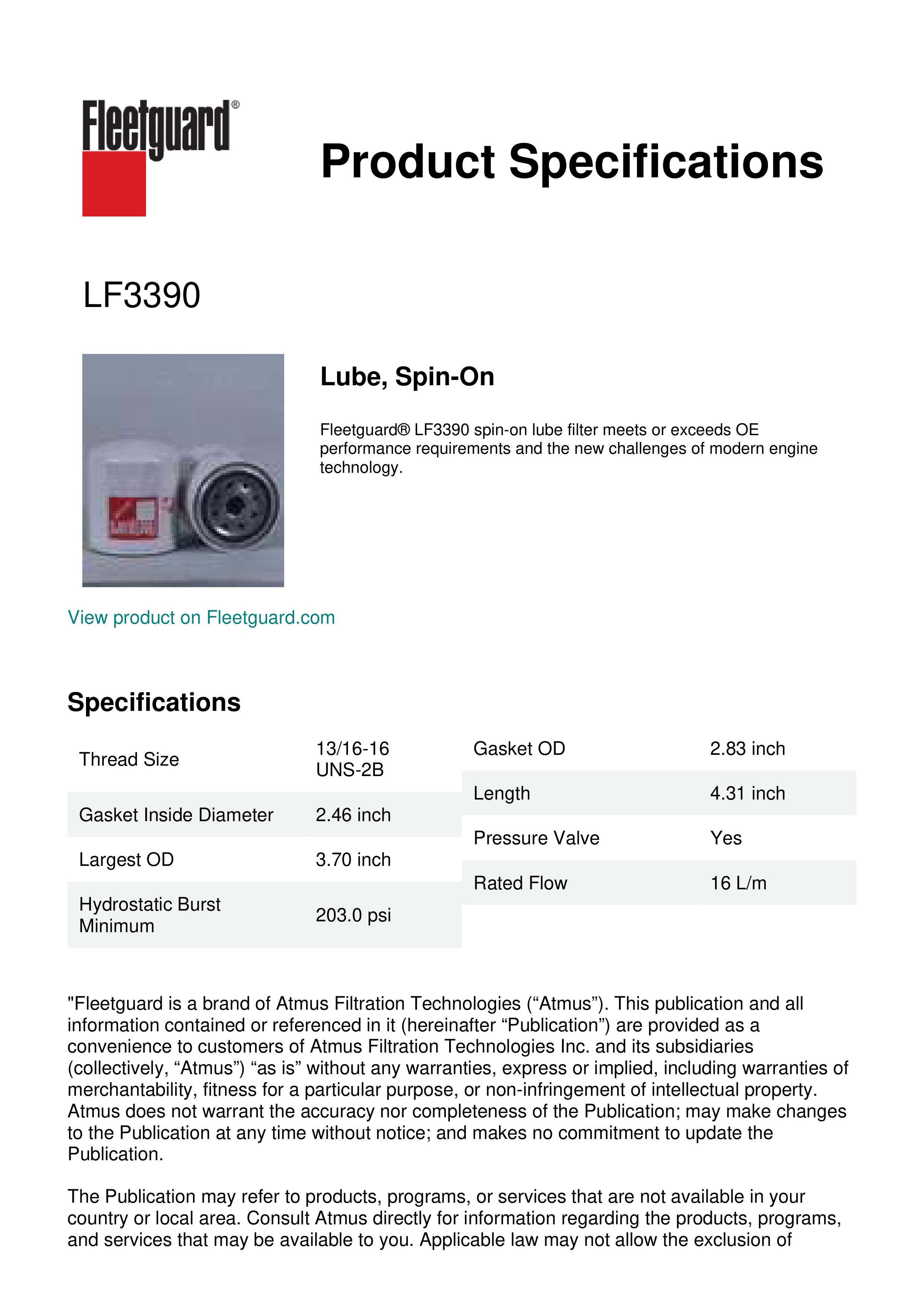 Fleetguard® LF3390 spin-on lube filter meets or exceeds OE performance requirements and the new challenges of modern engine technology.Specification
