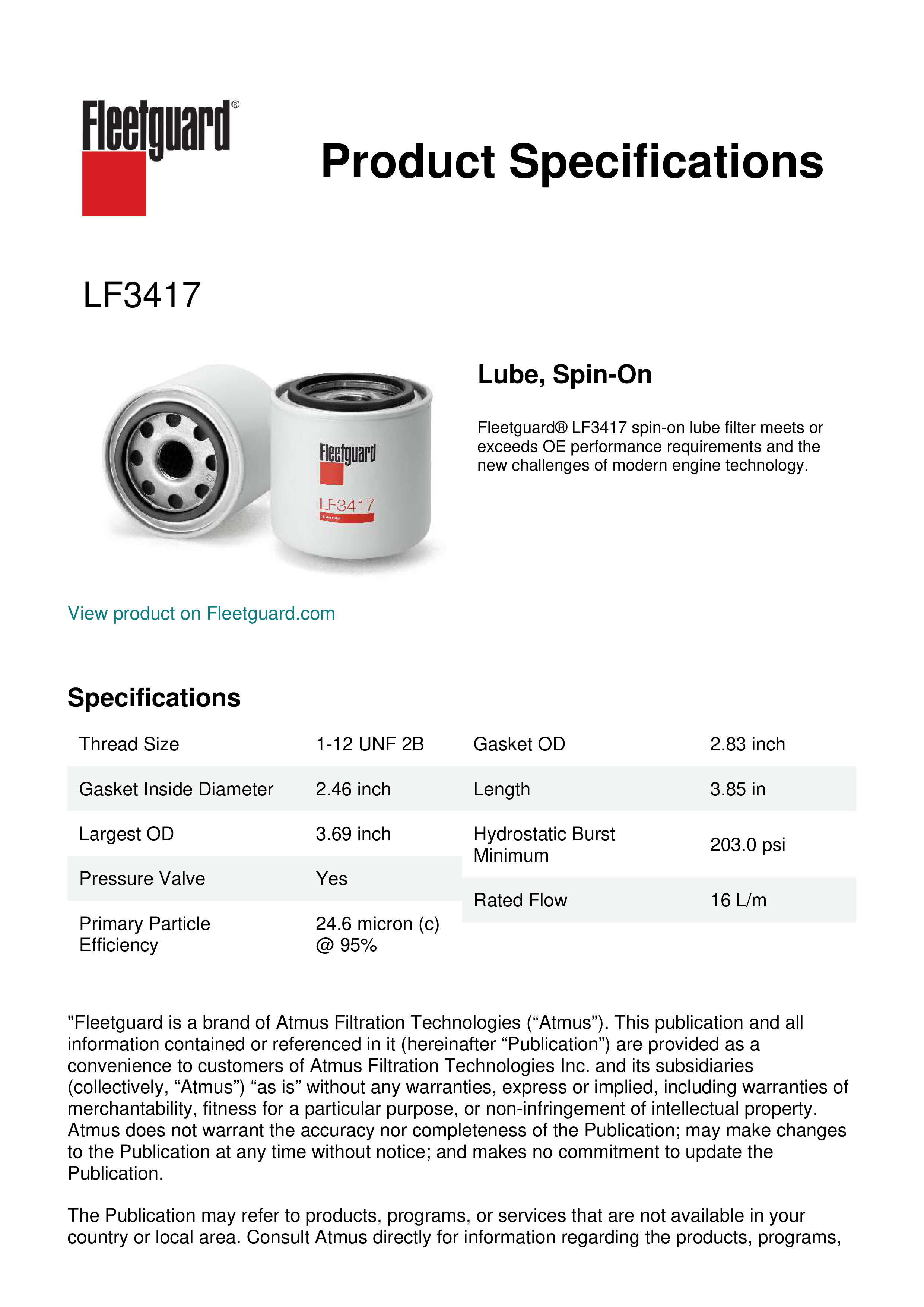 Fleetguard® LF3417 spin-on lube filter meets or exceeds OE performance requirements and the new challenges of modern engine technology.Specification