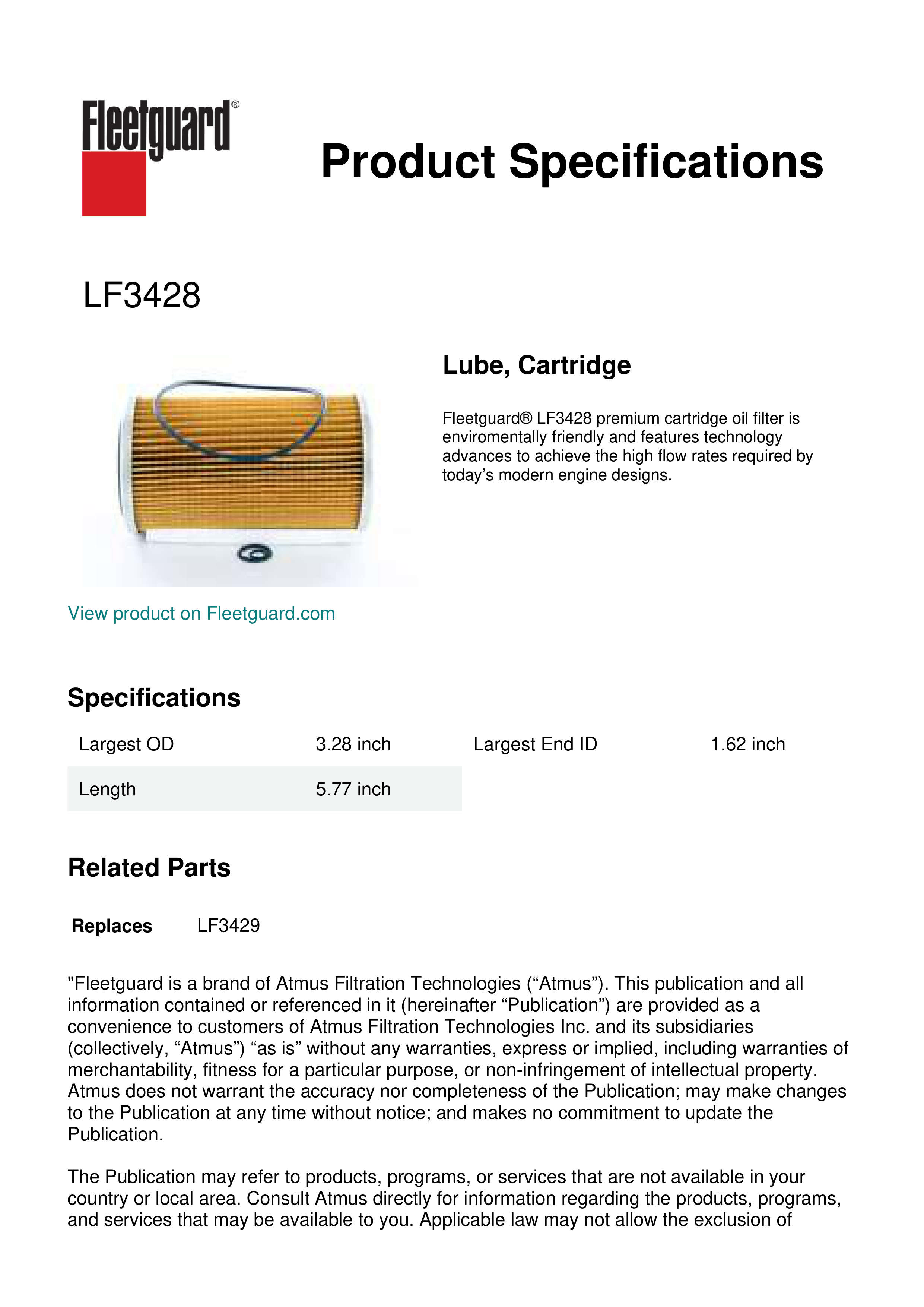 Fleetguard® LF3428 premium cartridge oil filter is enviromentally friendly and features technology advances to achieve the high flow rates required by today’s modern engine designs.Specification