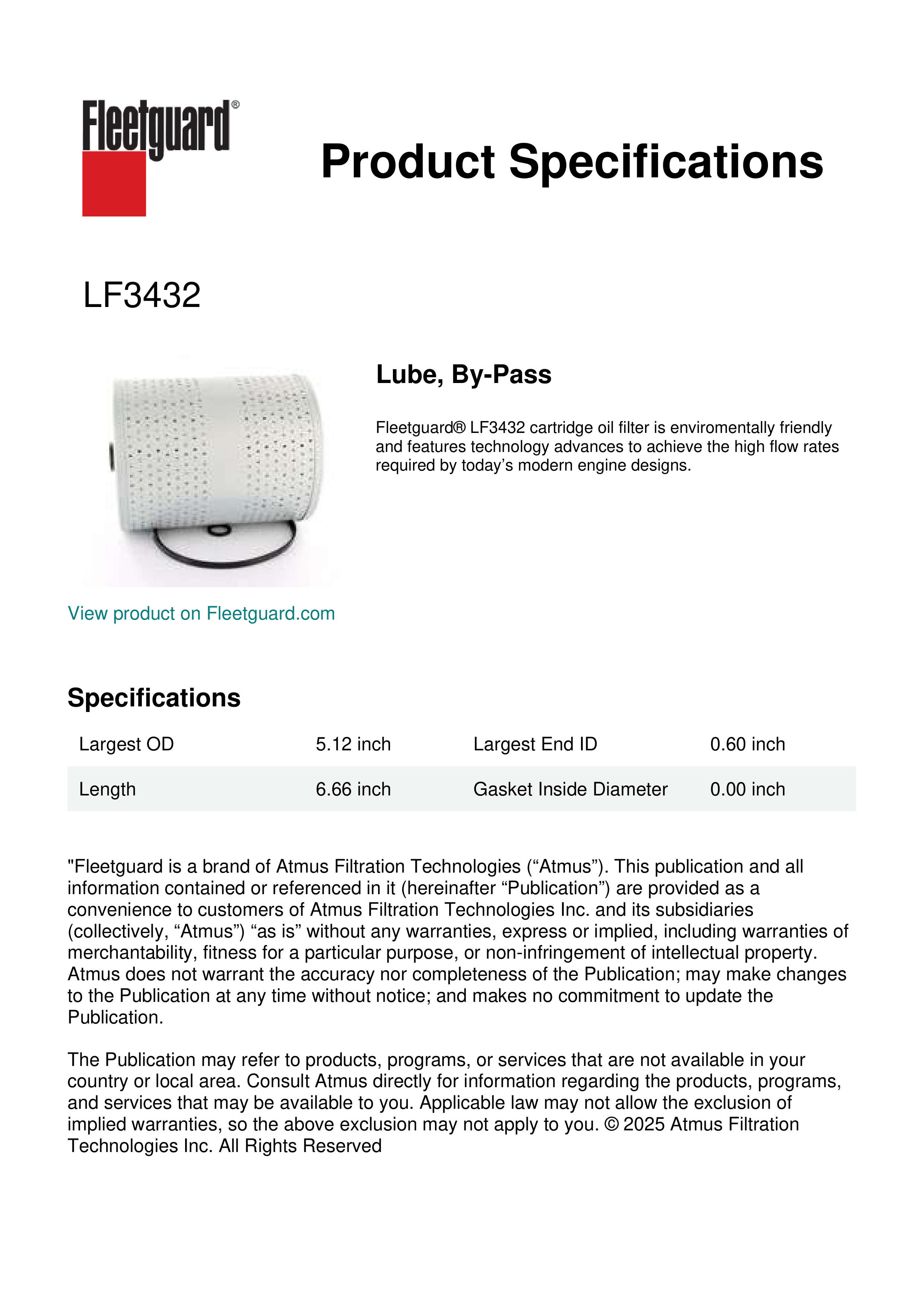 Fleetguard® LF3432 cartridge oil filter is enviromentally friendly and features technology advances to achieve the high flow rates required by today’s modern engine designs.Specification