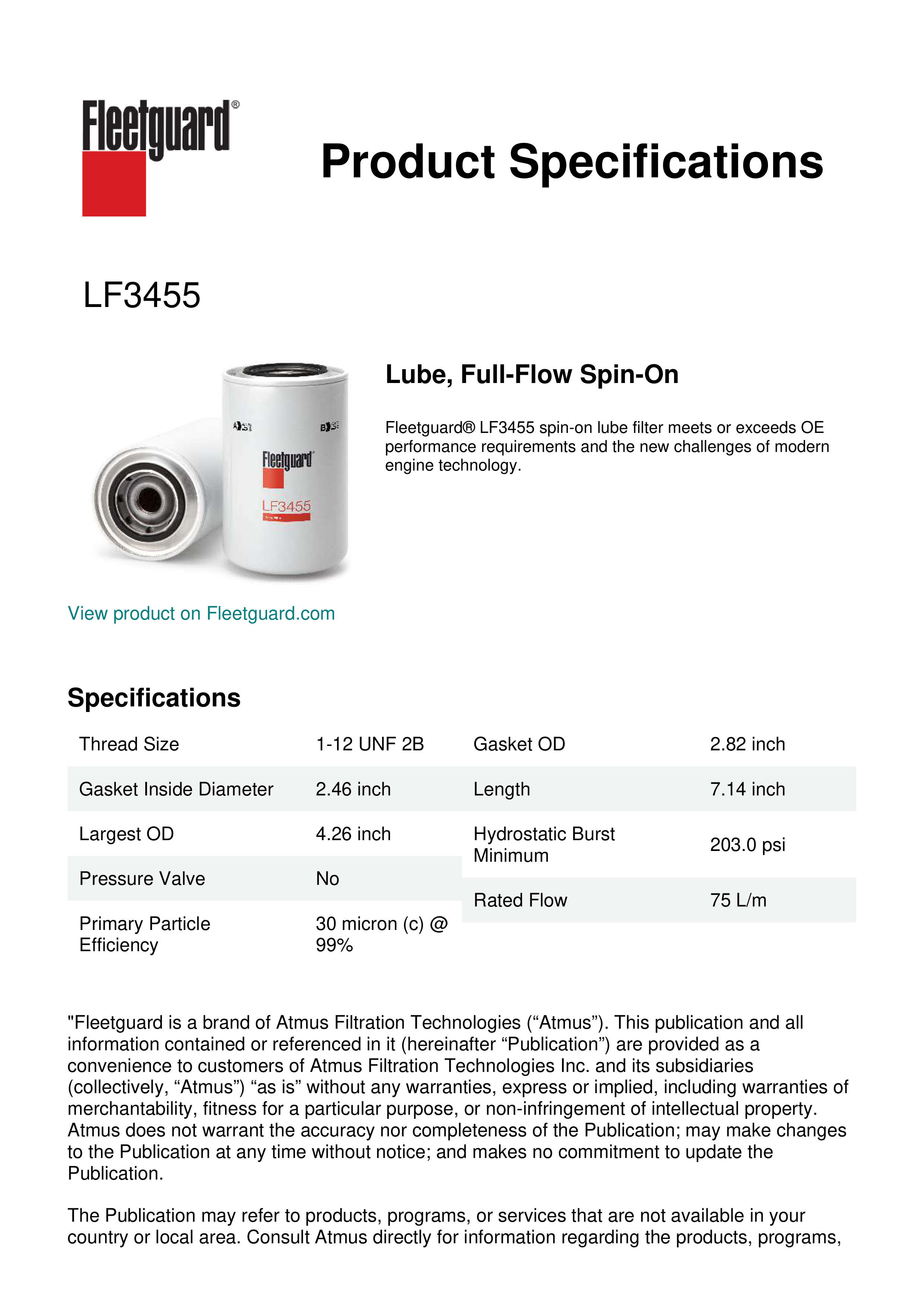 Fleetguard® LF3455 spin-on lube filter meets or exceeds OE performance requirements and the new challenges of modern engine technology.Specification