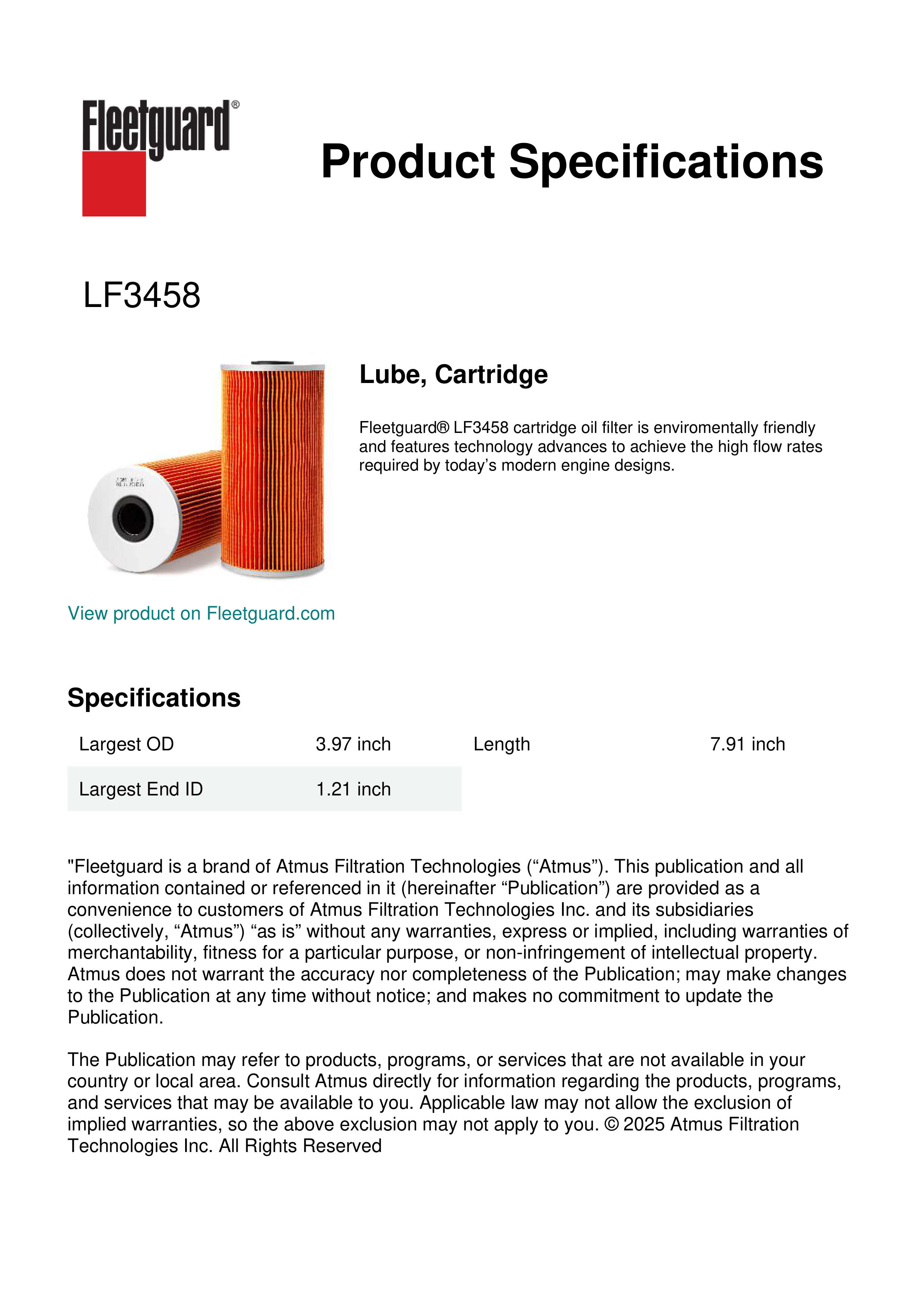 Fleetguard® LF3458 cartridge oil filter is enviromentally friendly and features technology advances to achieve the high flow rates required by today’s modern engine designs.Specification