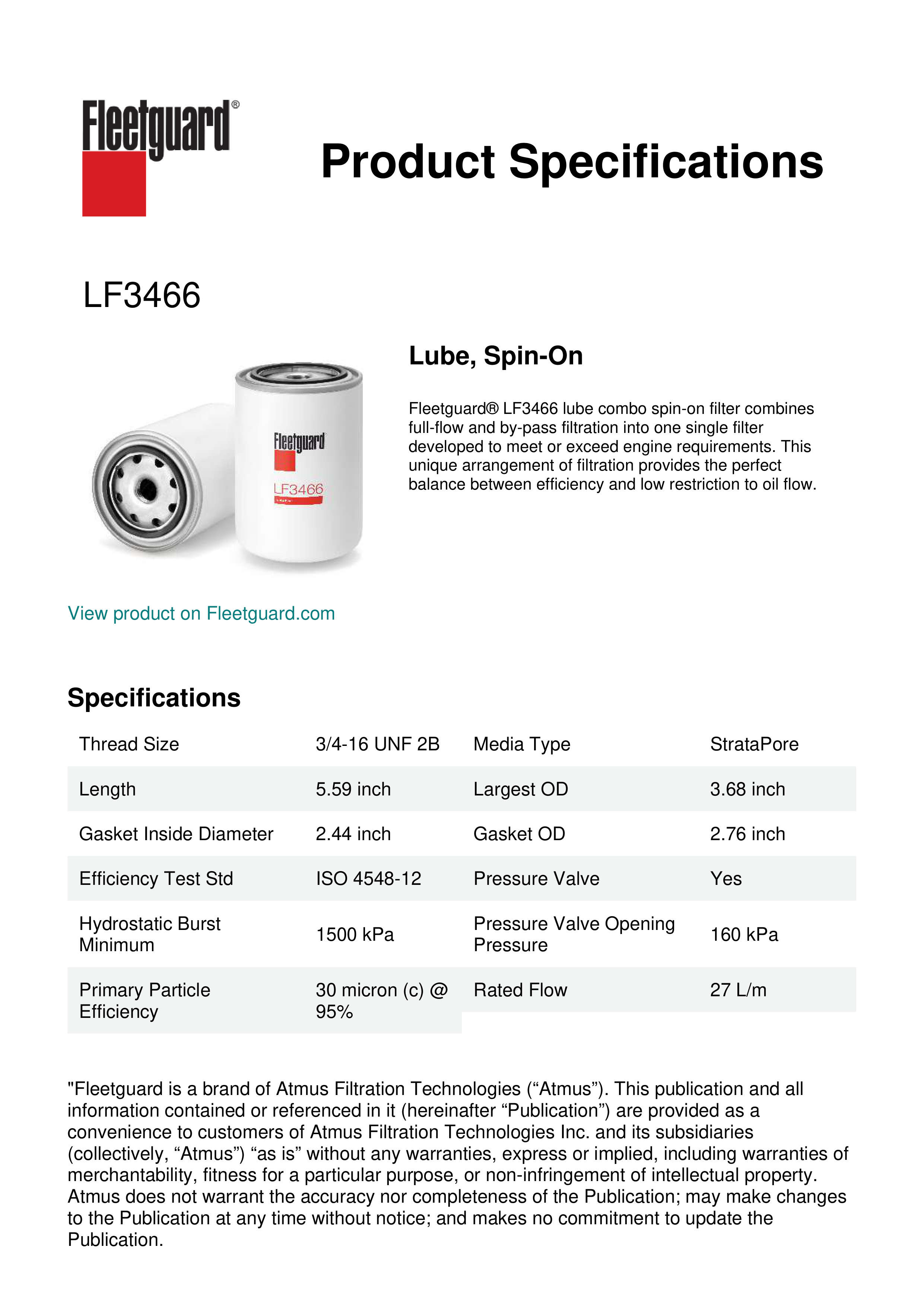 Fleetguard® LF3466 lube combo spin-on filter combines full-flow and by-pass filtration into one single filter developed to meet or exceed engine requirements. This unique arrangement of filtration provides the perfect balance between efficiency and low restriction to oil flow.Specification