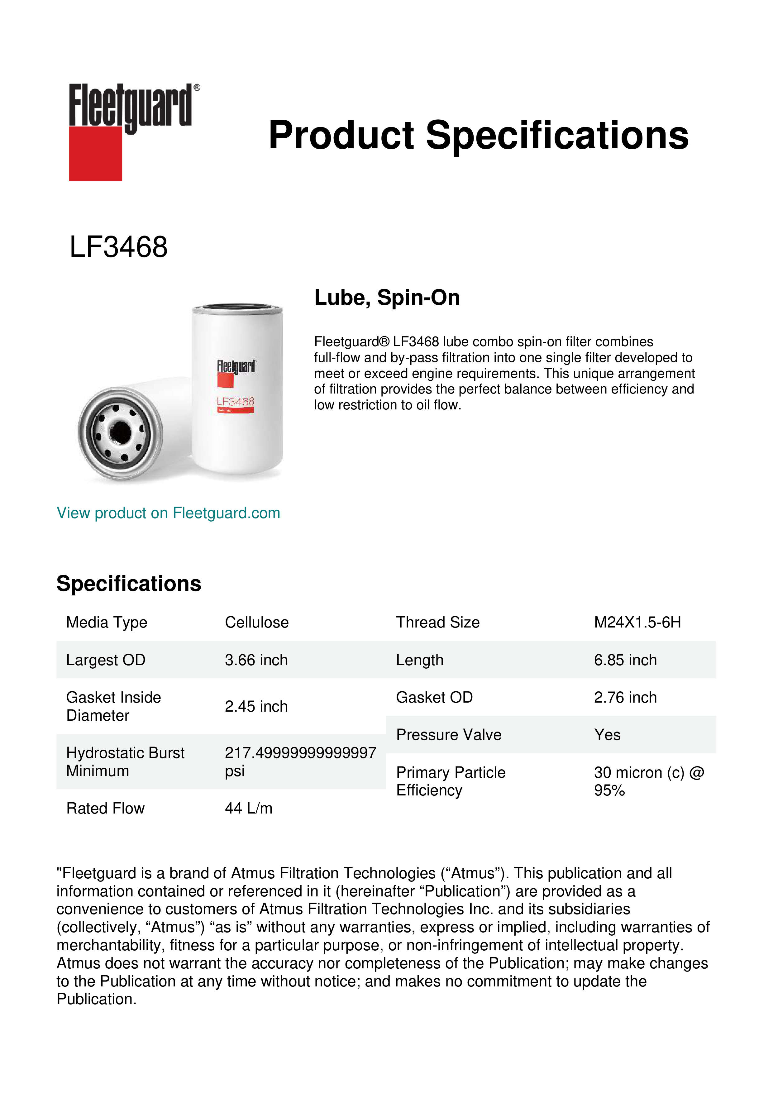 Fleetguard® LF3468 lube combo spin-on filter combines full-flow and by-pass filtration into one single filter developed to meet or exceed engine requirements. This unique arrangement of filtration provides the perfect balance between efficiency and low restriction to oil flow.Specification