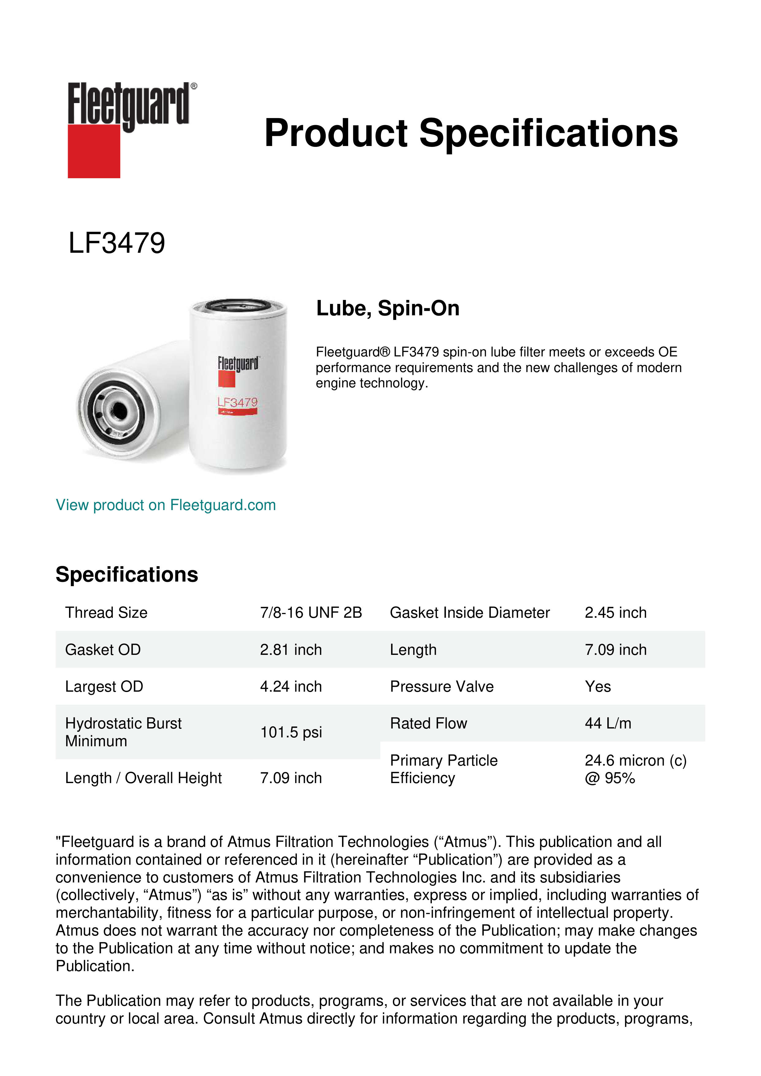 Fleetguard® LF3479 spin-on lube filter meets or exceeds OE performance requirements and the new challenges of modern engine technology.Specification