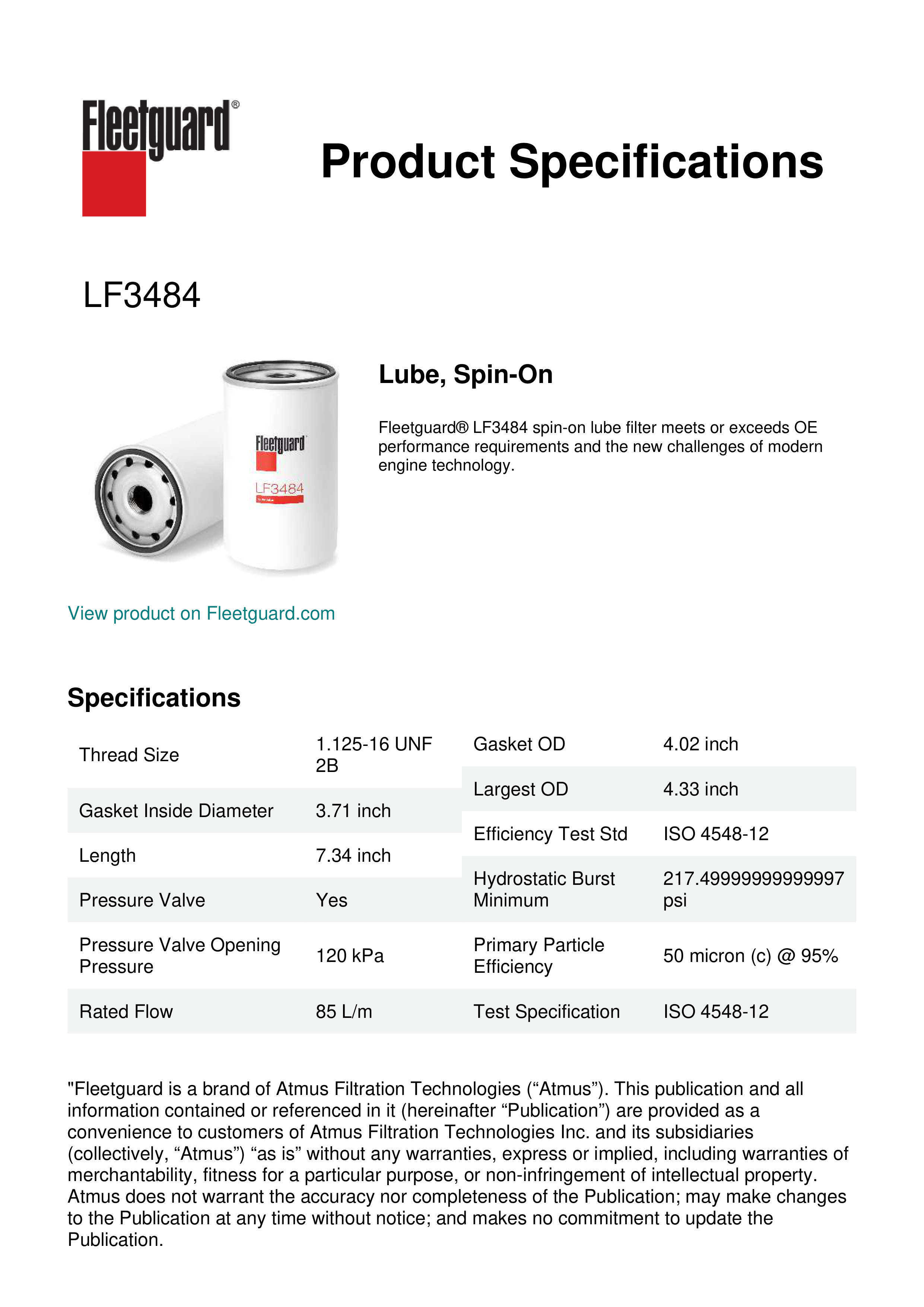 Fleetguard® LF3484 spin-on lube filter meets or exceeds OE performance requirements and the new challenges of modern engine technology.Specification