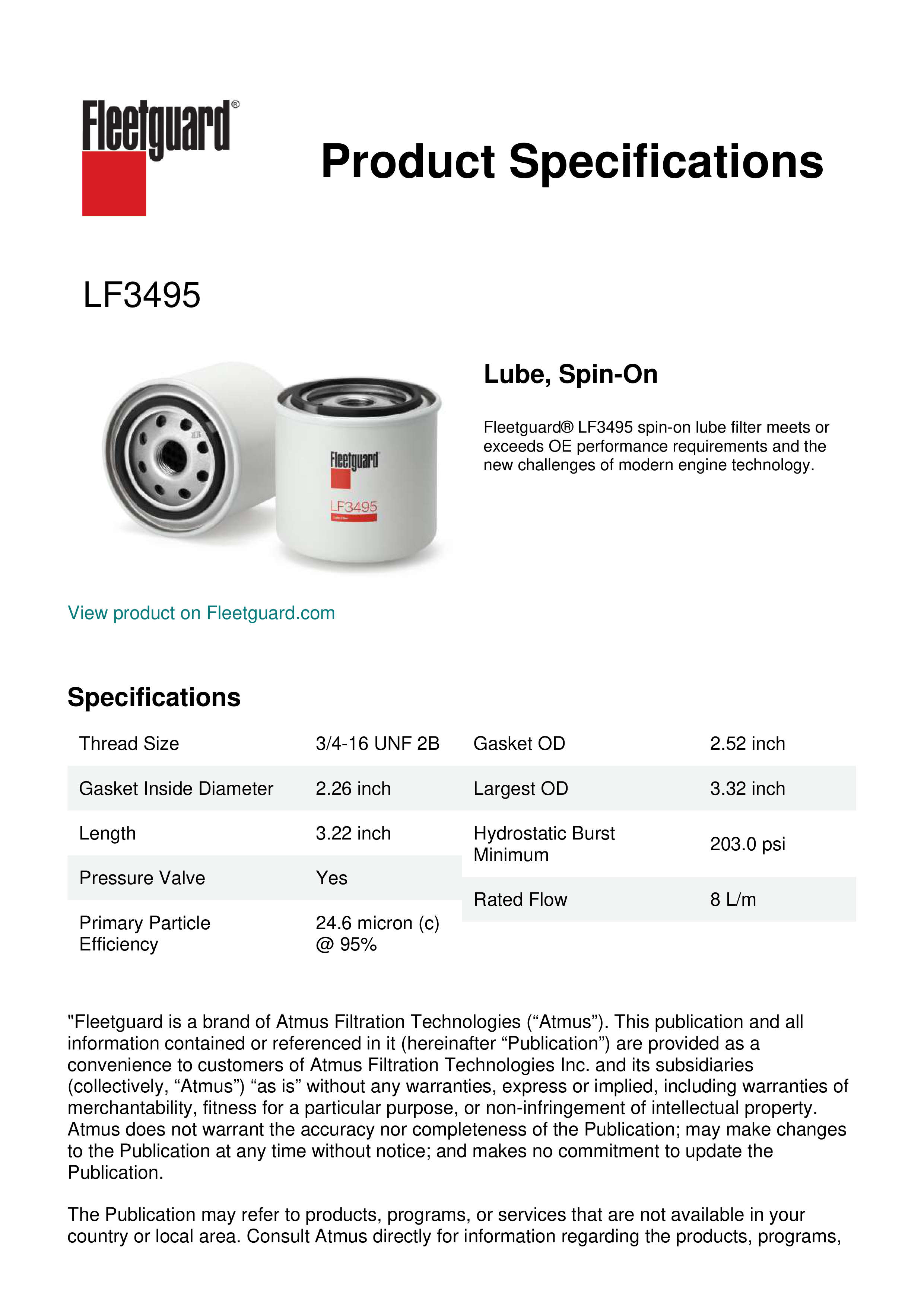 Fleetguard® LF3495 spin-on lube filter meets or exceeds OE performance requirements and the new challenges of modern engine technology.Specification