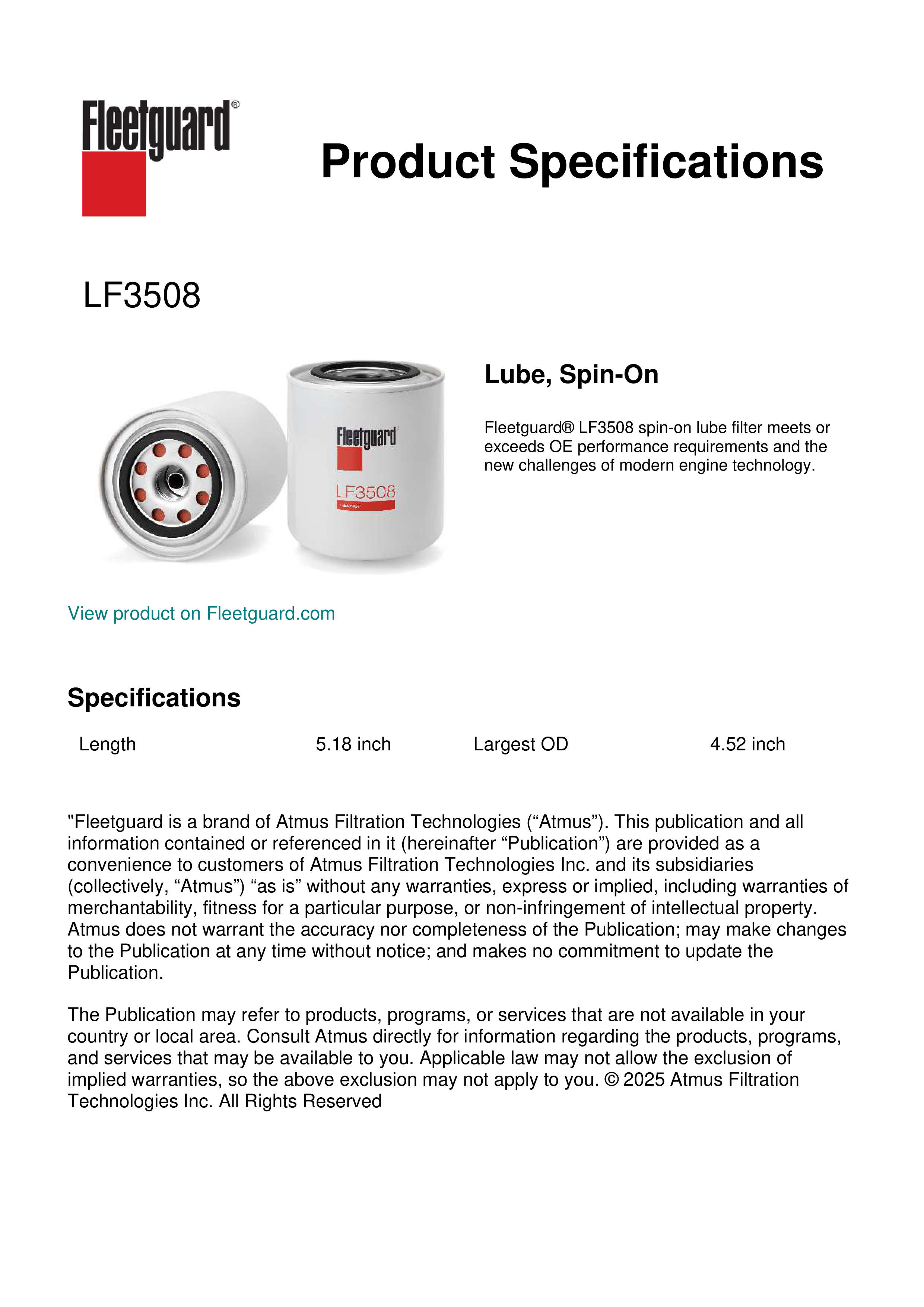 Fleetguard® LF3508 spin-on lube filter meets or exceeds OE performance requirements and the new challenges of modern engine technology.Specification