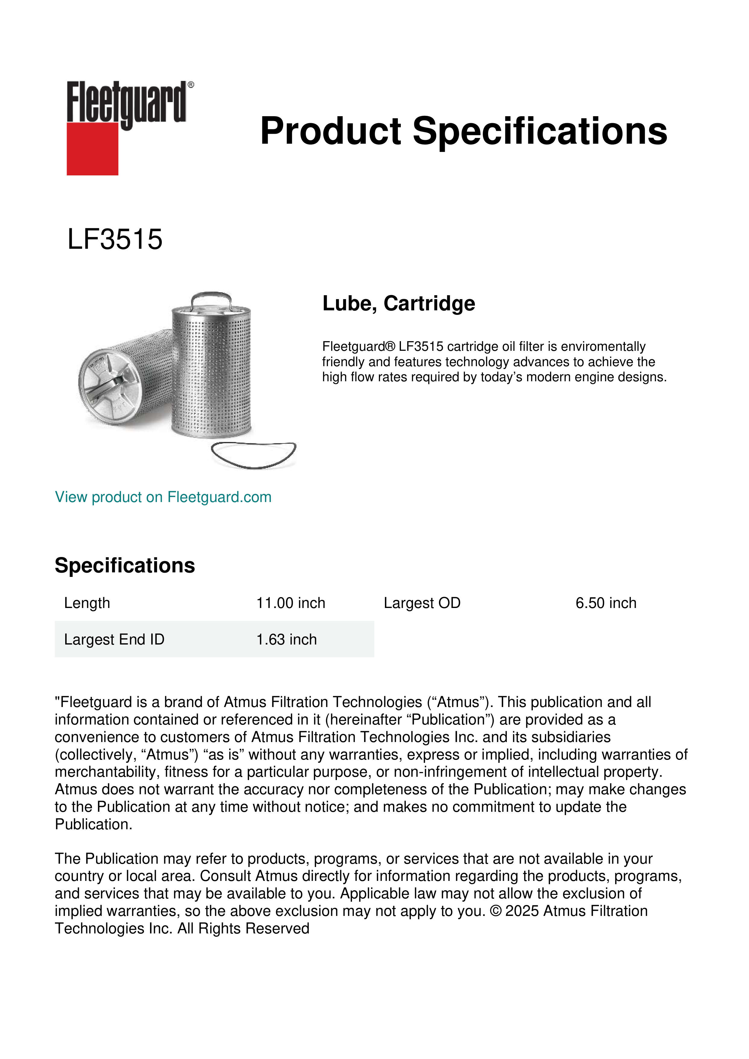 Fleetguard® LF3515 cartridge oil filter is enviromentally friendly and features technology advances to achieve the high flow rates required by today’s modern engine designs.