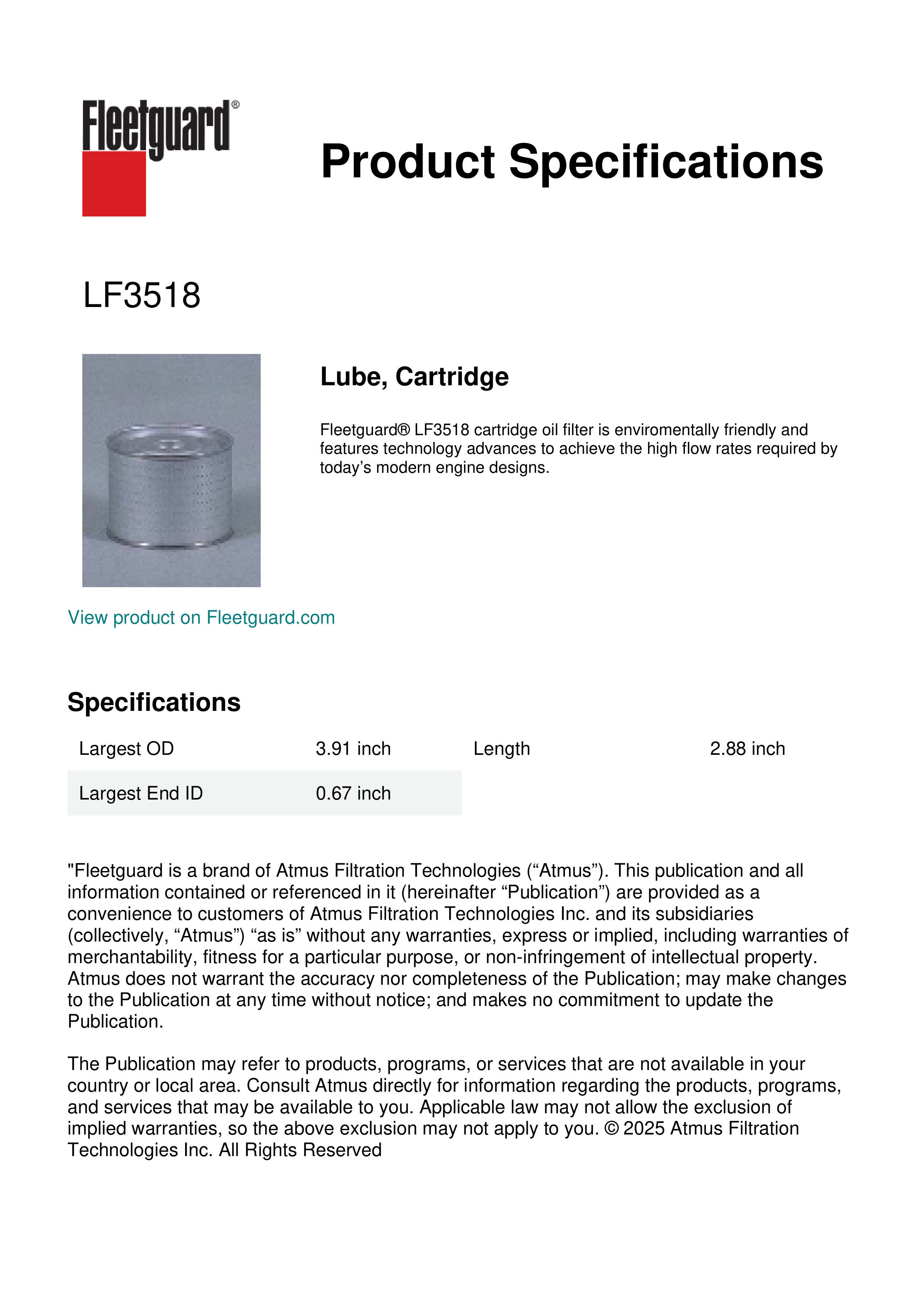 Fleetguard® LF3518 cartridge oil filter is enviromentally friendly and features technology advances to achieve the high flow rates required by today’s modern engine designs.Specification