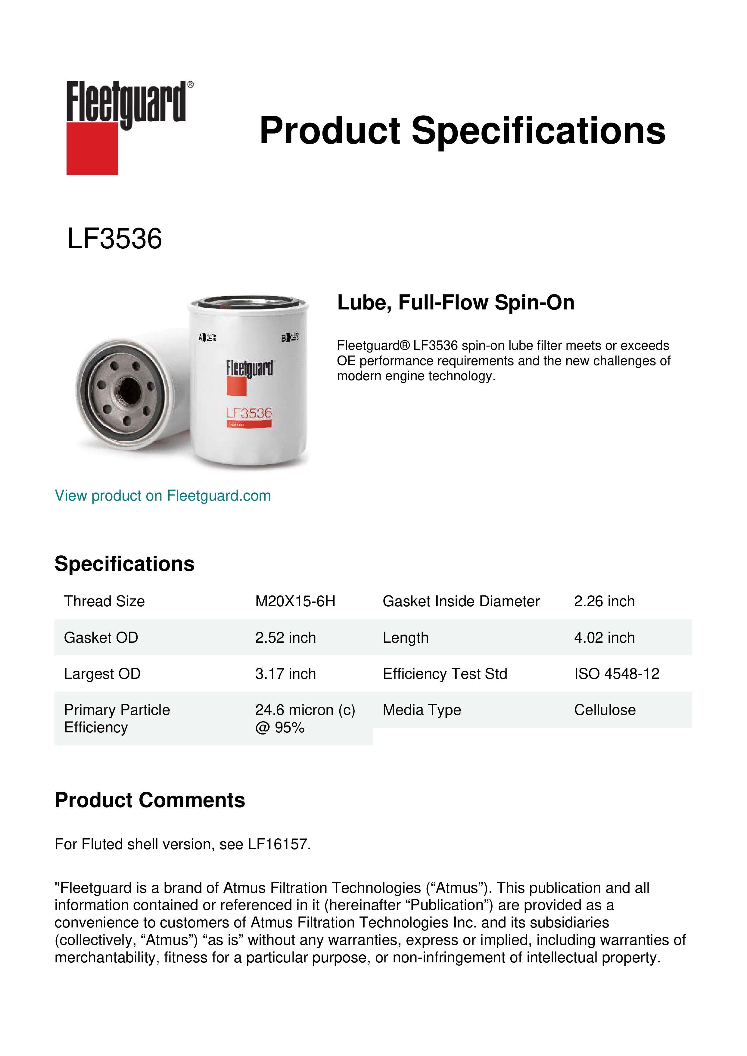 Fleetguard® LF3536 spin-on lube filter meets or exceeds OE performance requirements and the new challenges of modern engine technology.Specification