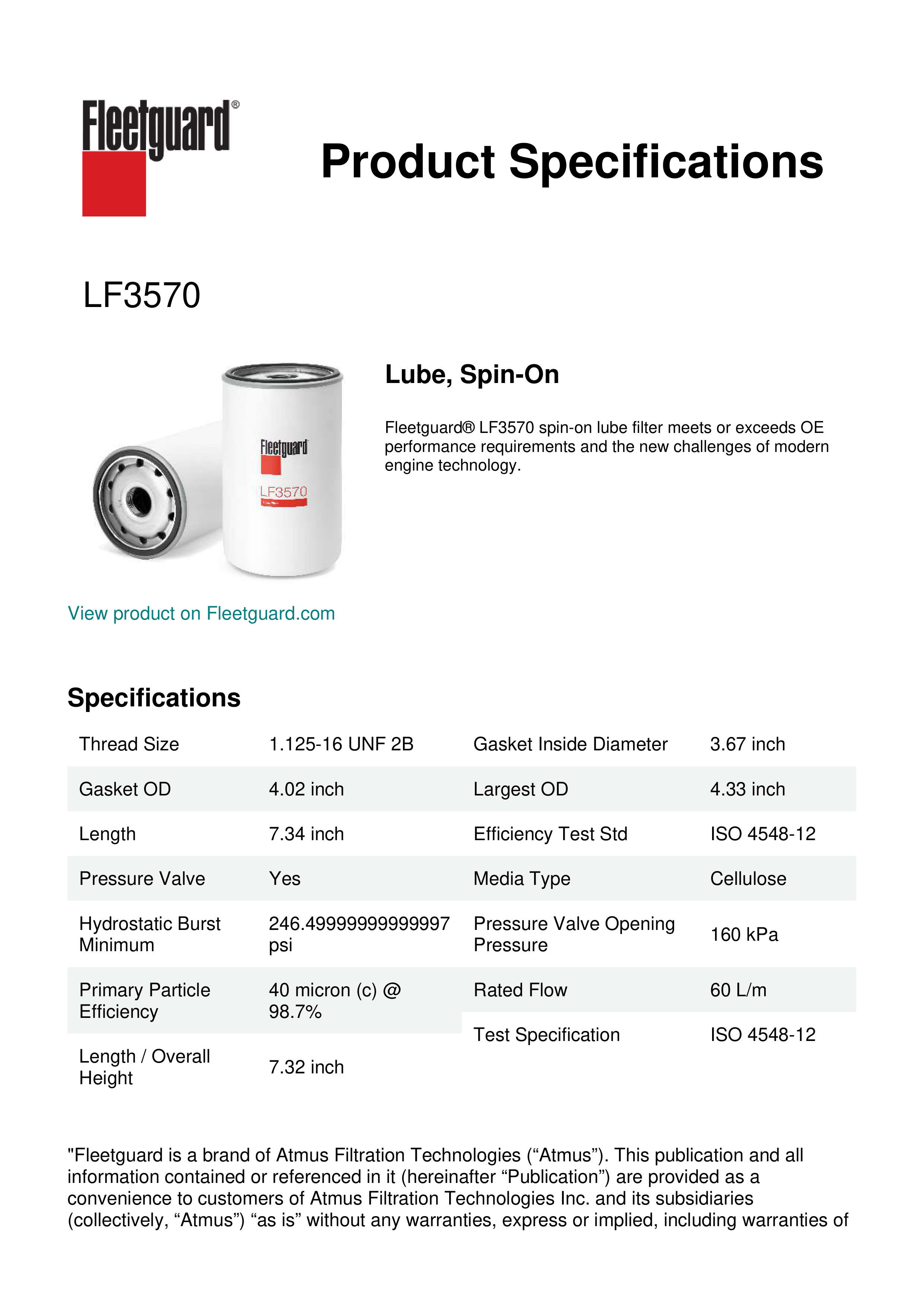Fleetguard® LF3570 spin-on lube filter meets or exceeds OE performance requirements and the new challenges of modern engine technology.Specification