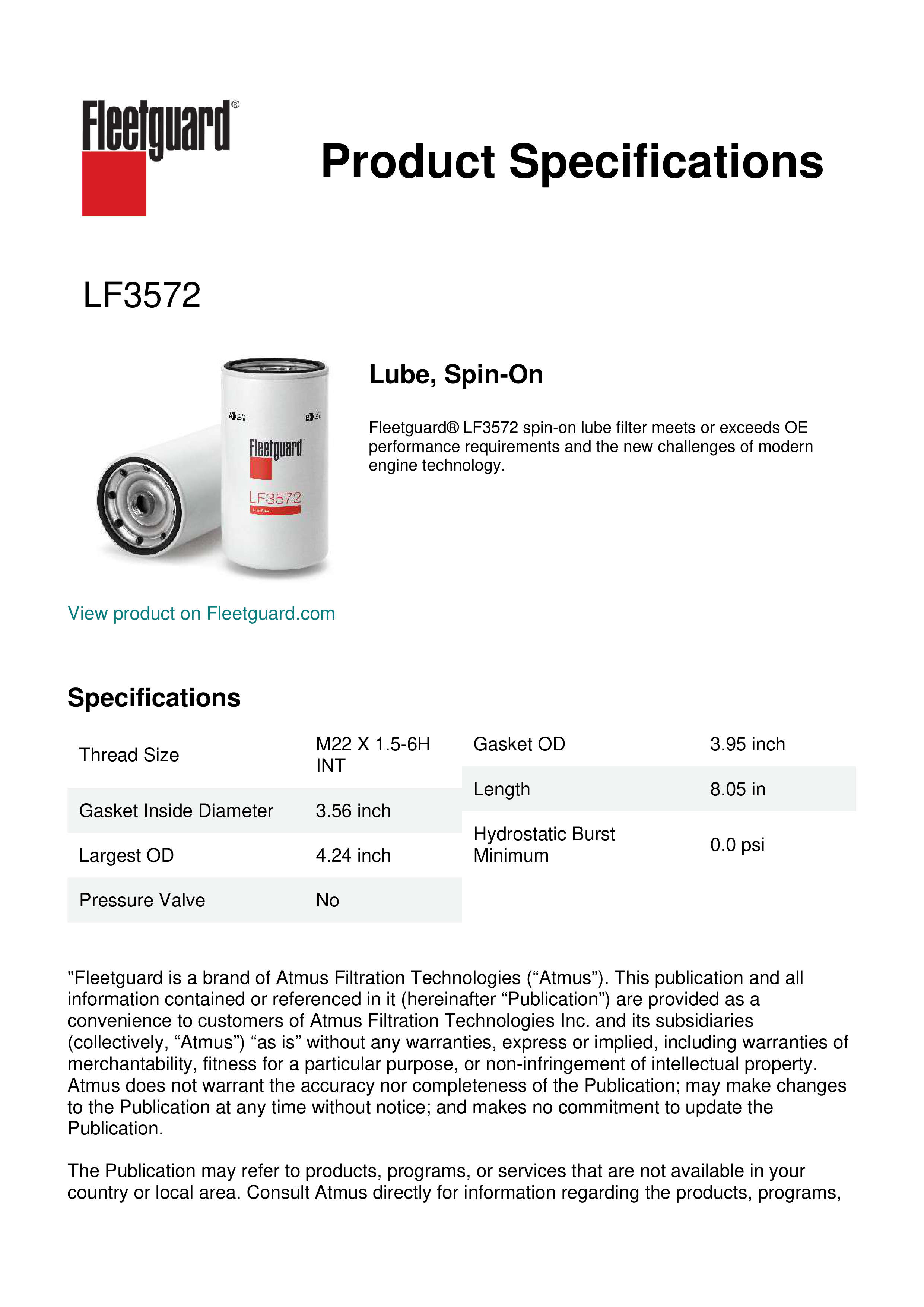 Fleetguard® LF3572 spin-on lube filter meets or exceeds OE performance requirements and the new challenges of modern engine technology.Specification