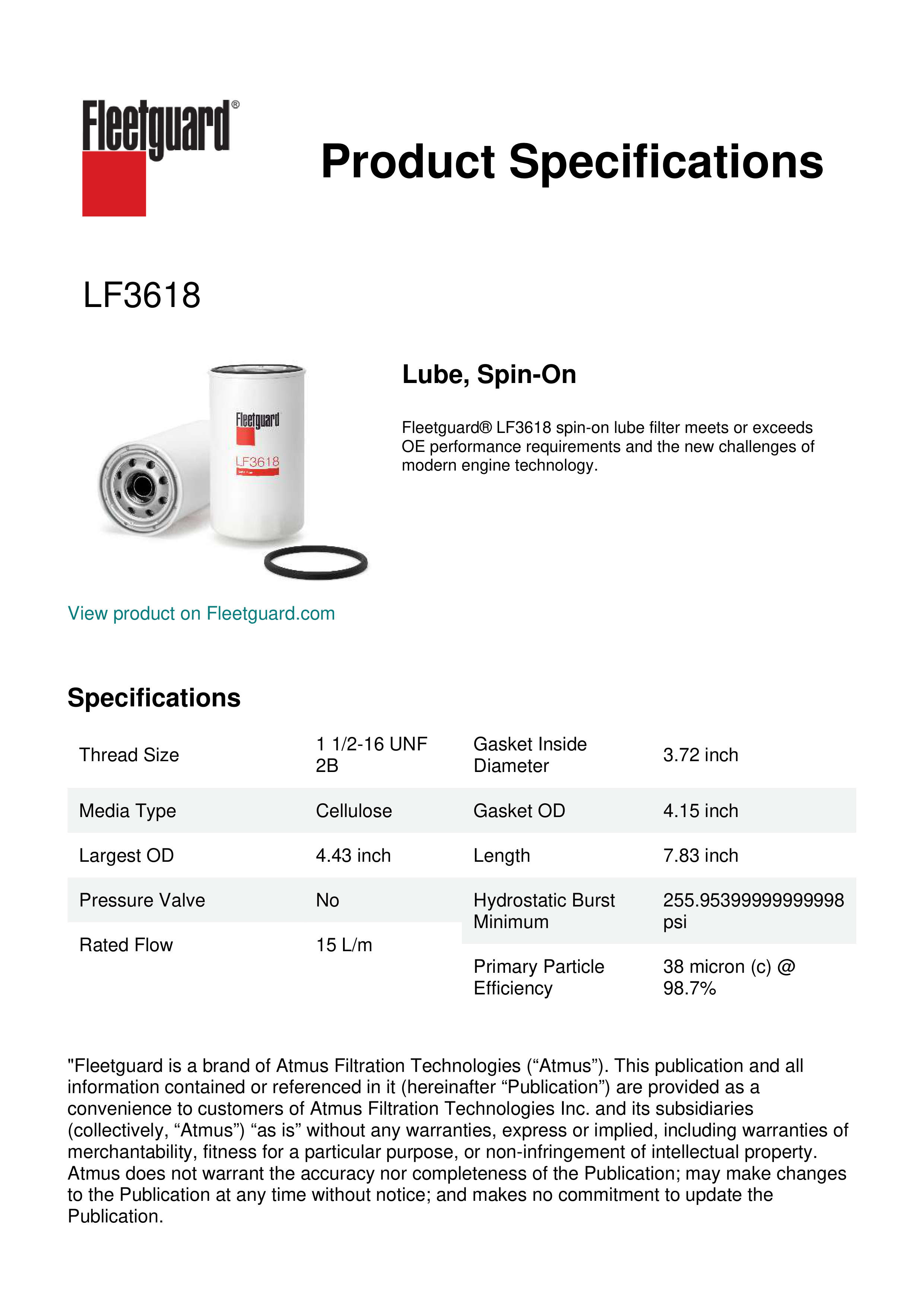Fleetguard® LF3618 spin-on lube filter meets or exceeds OE performance requirements and the new challenges of modern engine technology.Specification