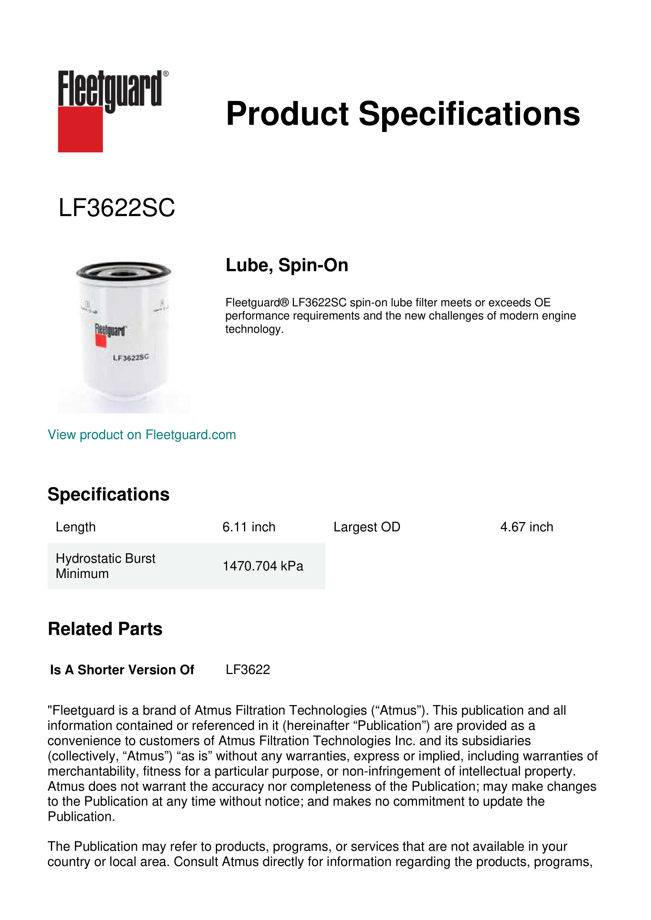 Fleetguard® LF3622SC spin-on lube filter meets or exceeds OE performance requirements and the new challenges of modern engine technology.Specification