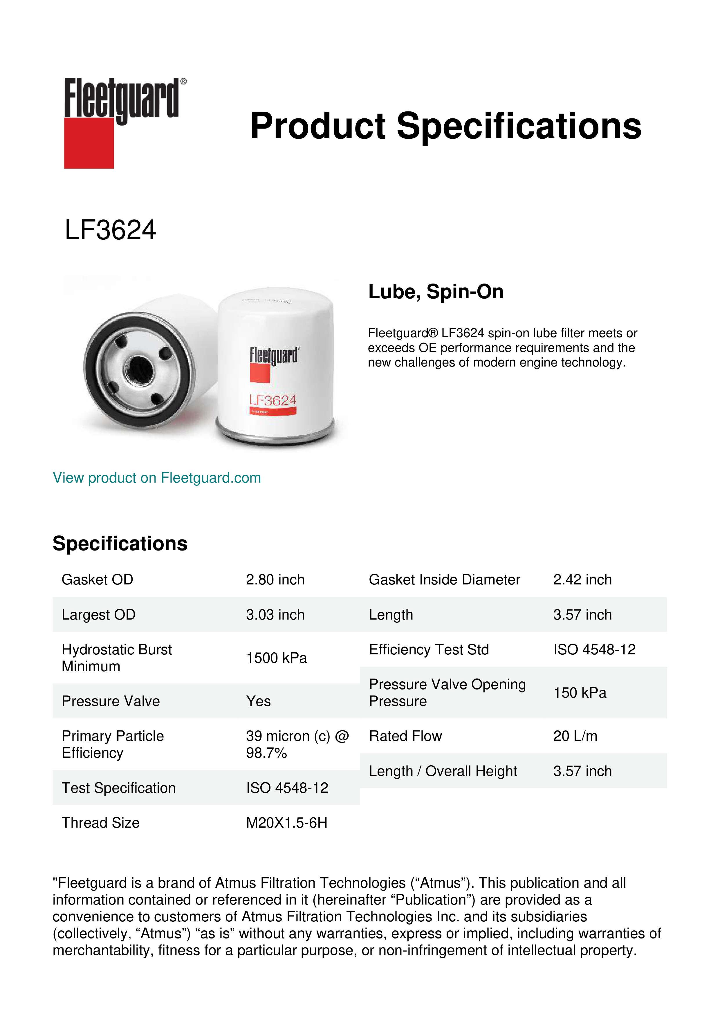 Fleetguard® LF3624 spin-on lube filter meets or exceeds OE performance requirements and the new challenges of modern engine technology.Specification
