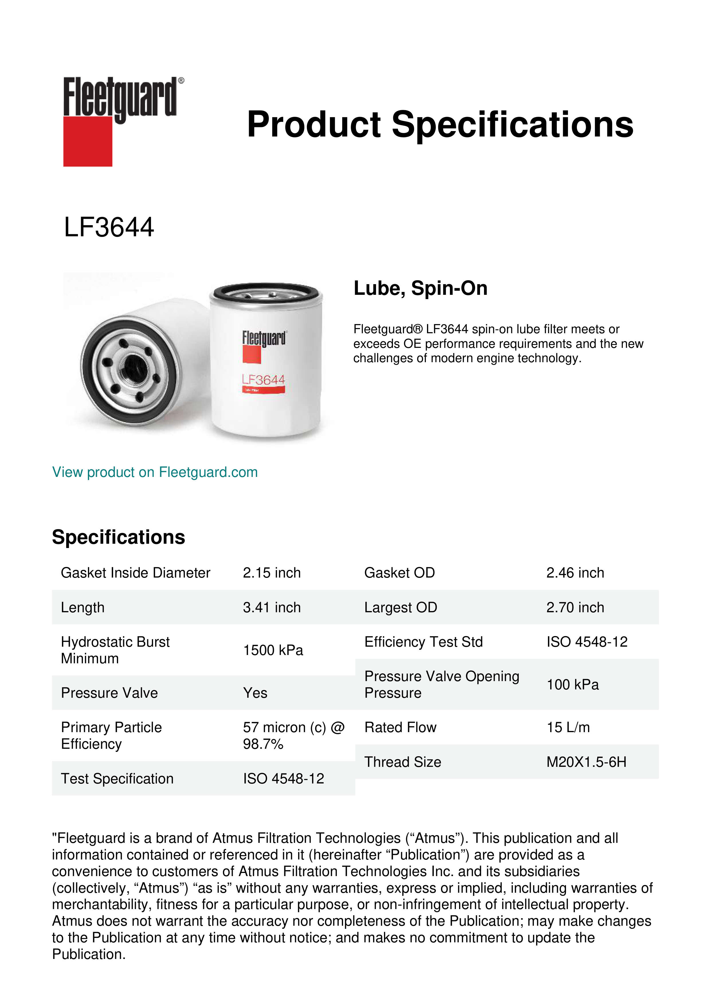 Fleetguard® LF3644 spin-on lube filter meets or exceeds OE performance requirements and the new challenges of modern engine technology.Specification