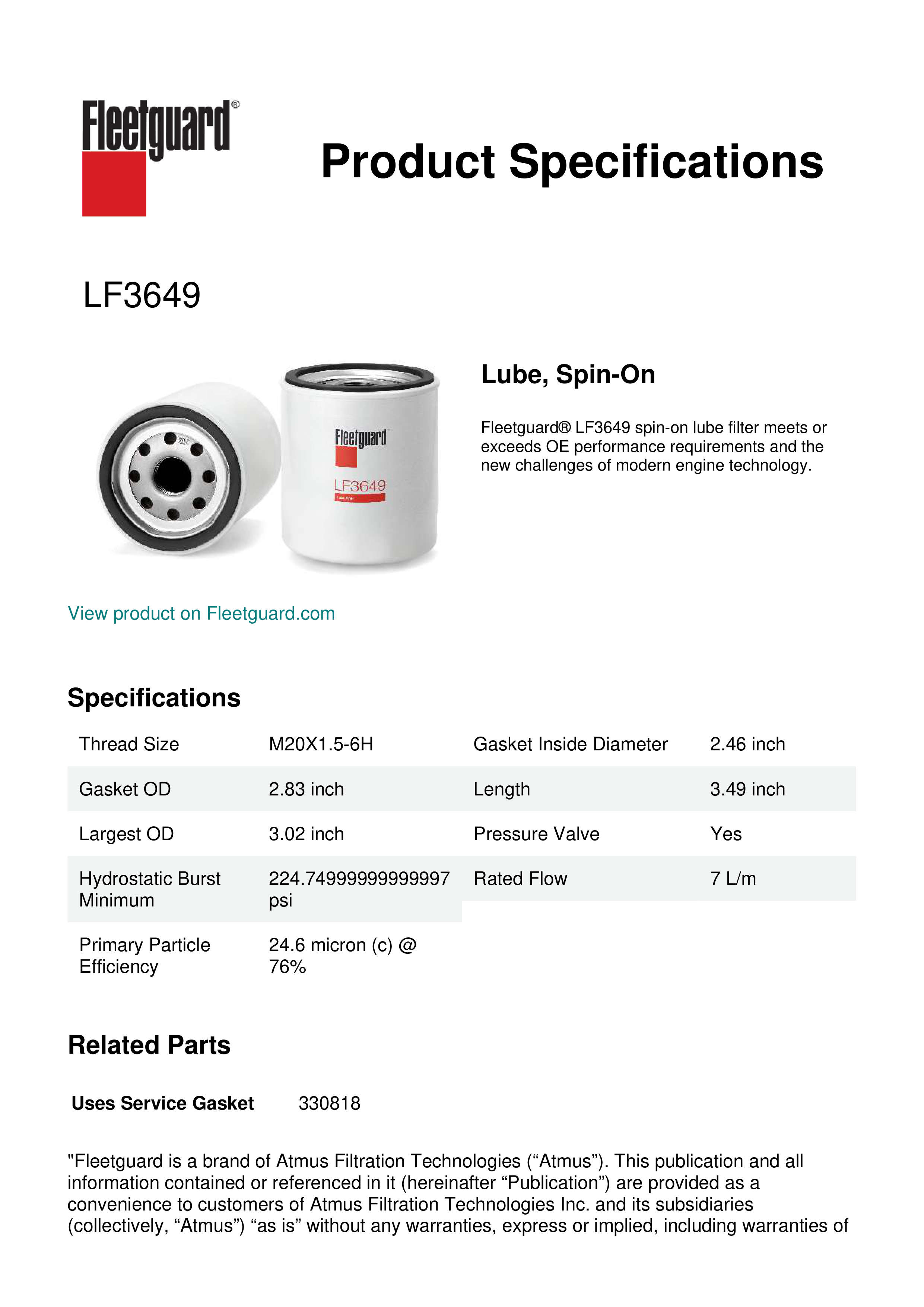 Fleetguard® LF3649 spin-on lube filter meets or exceeds OE performance requirements and the new challenges of modern engine technology.Specification