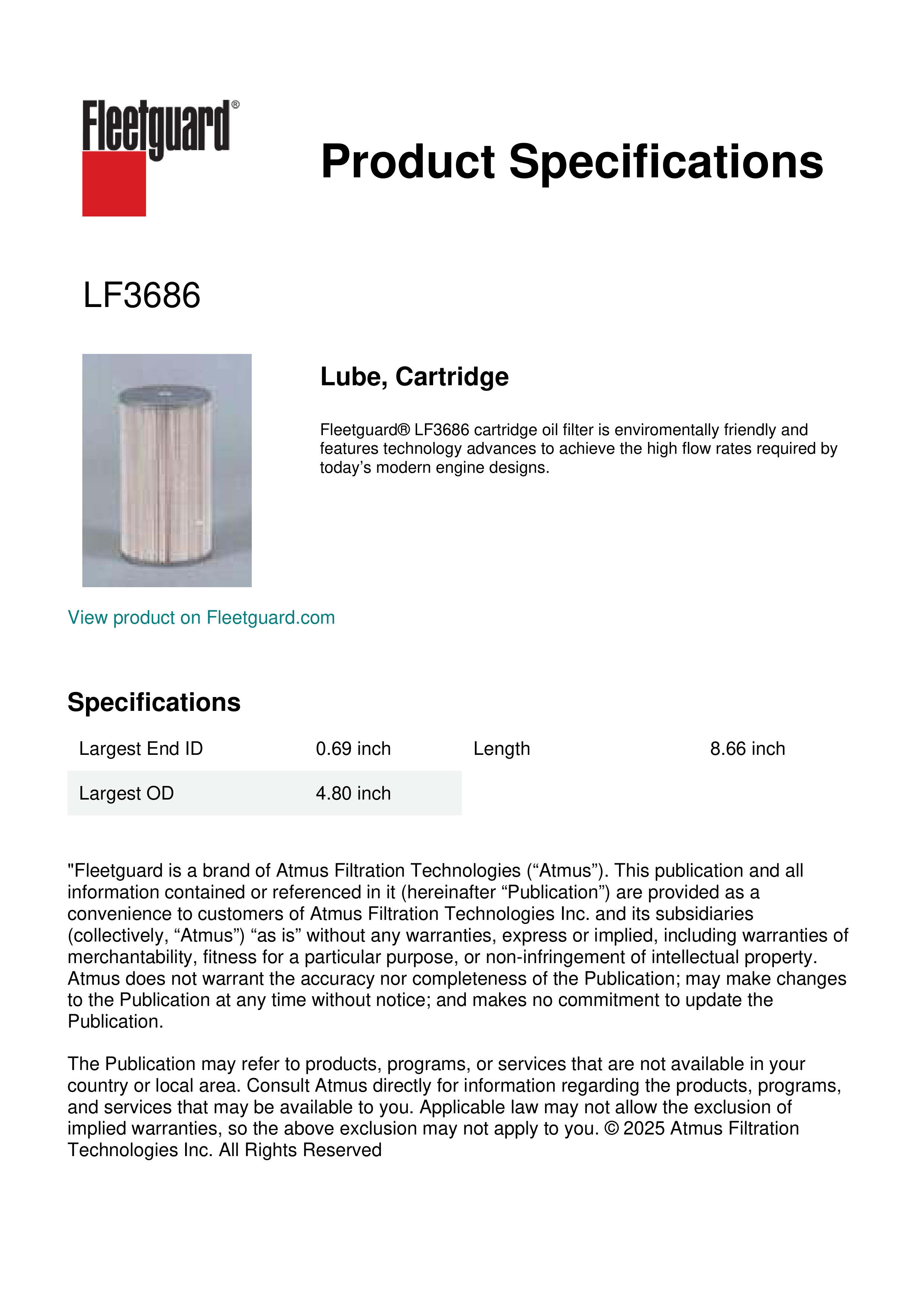 Fleetguard® LF3686 cartridge oil filter is enviromentally friendly and features technology advances to achieve the high flow rates required by today’s modern engine designs.Specification