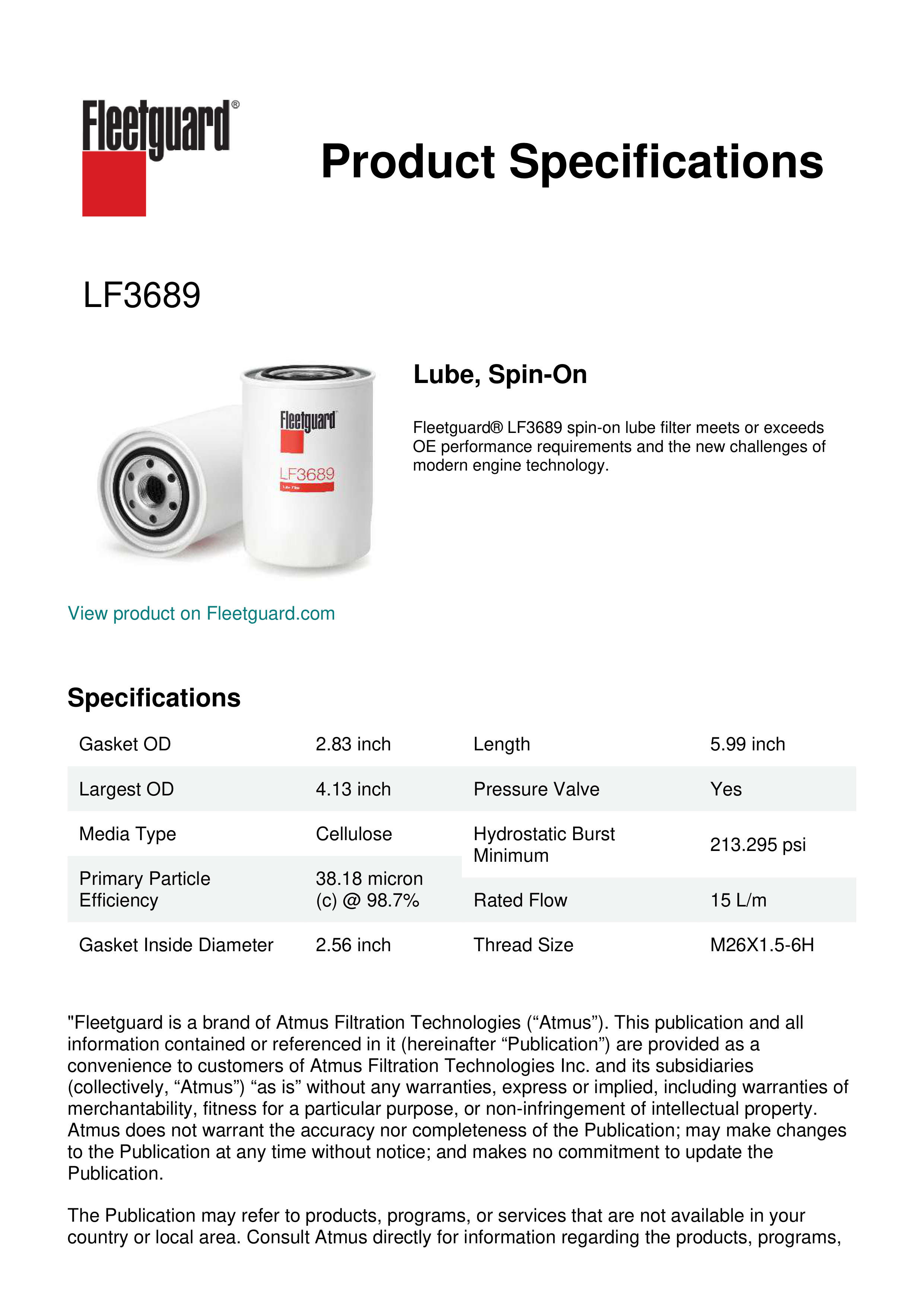 Fleetguard® LF3689 spin-on lube filter meets or exceeds OE performance requirements and the new challenges of modern engine technology.Specification