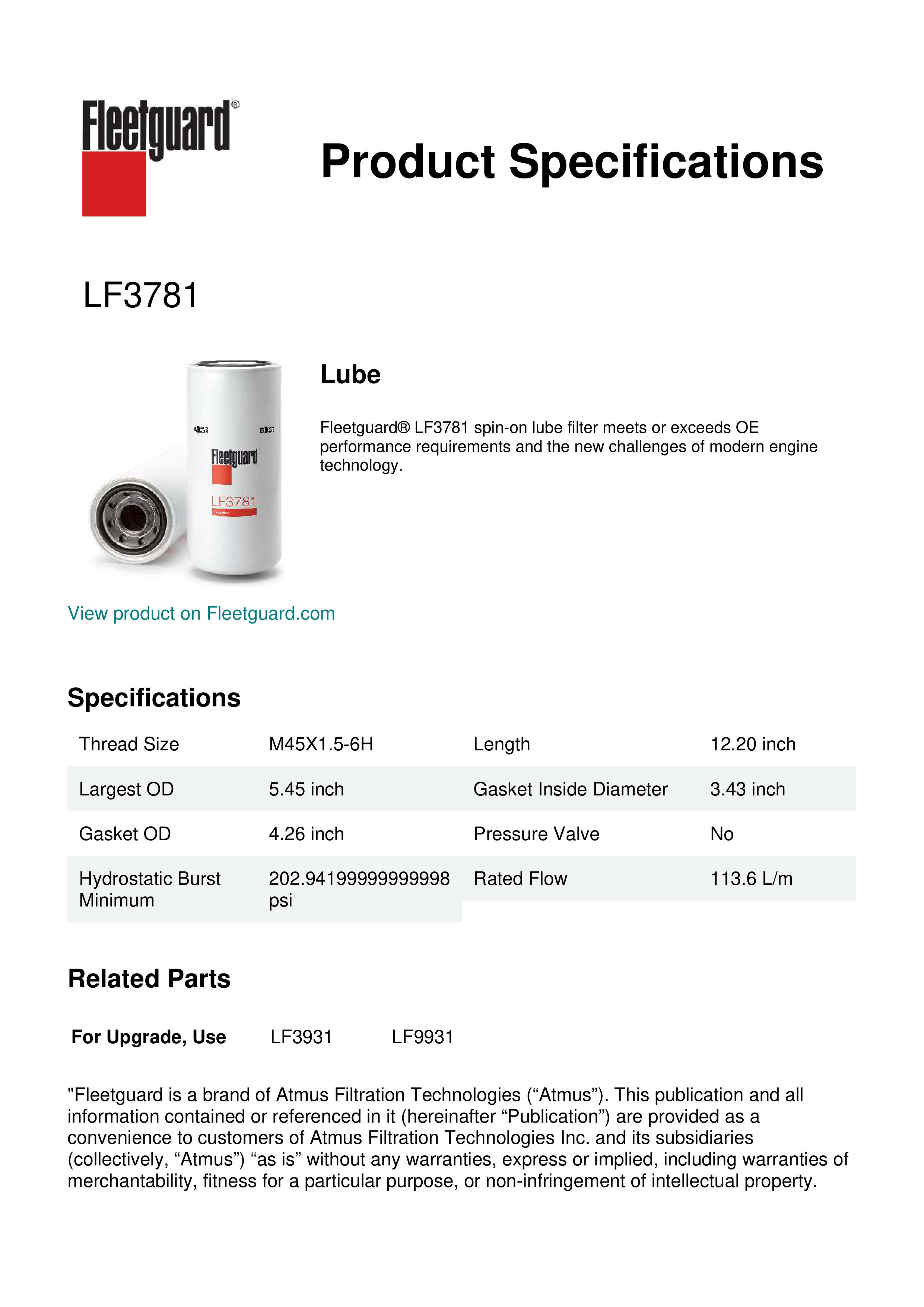 Fleetguard® LF3781 spin-on lube filter meets or exceeds OE performance requirements and the new challenges of modern engine technology.Specification
