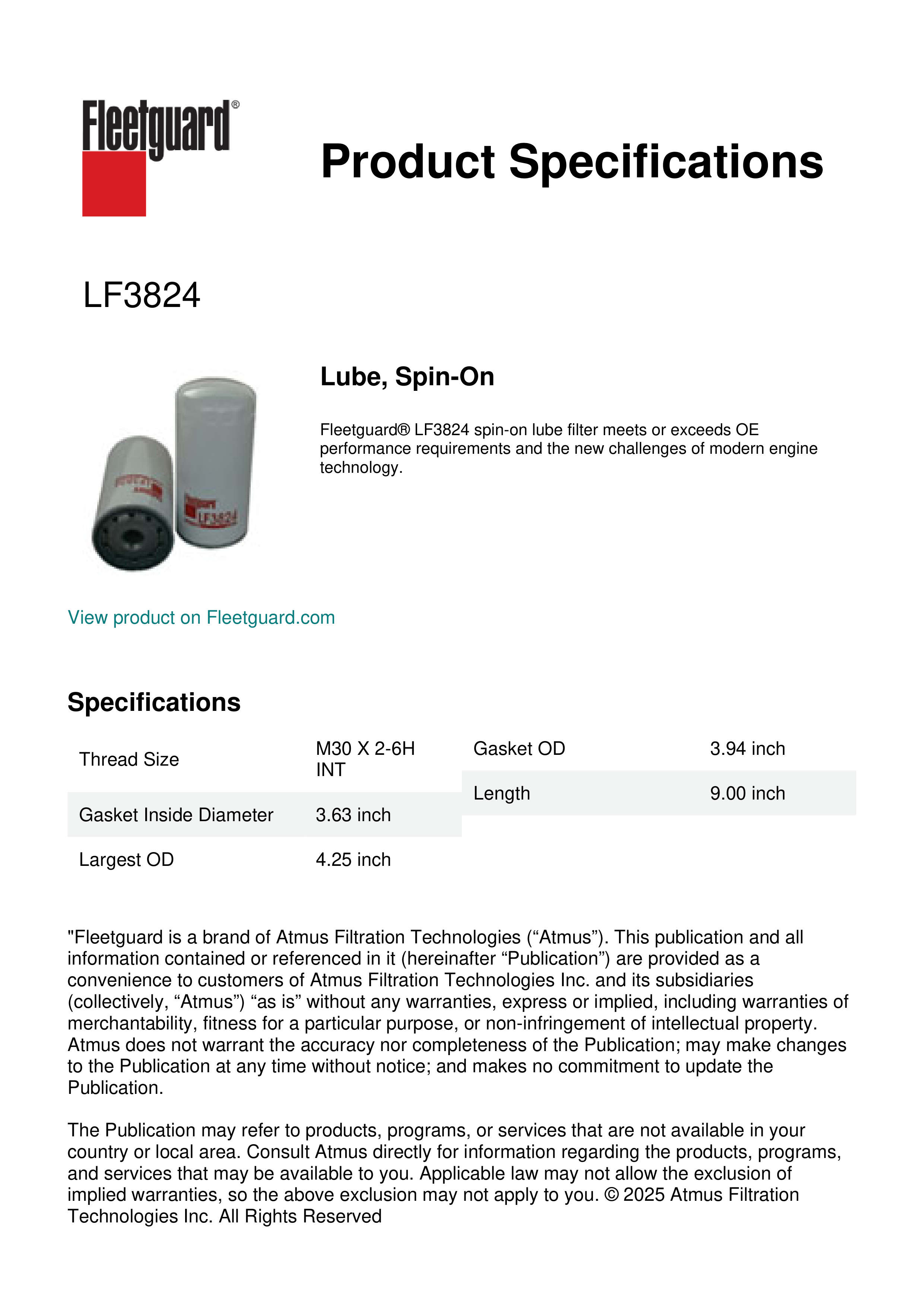 Fleetguard® LF3824 spin-on lube filter meets or exceeds OE performance requirements and the new challenges of modern engine technology.Specification