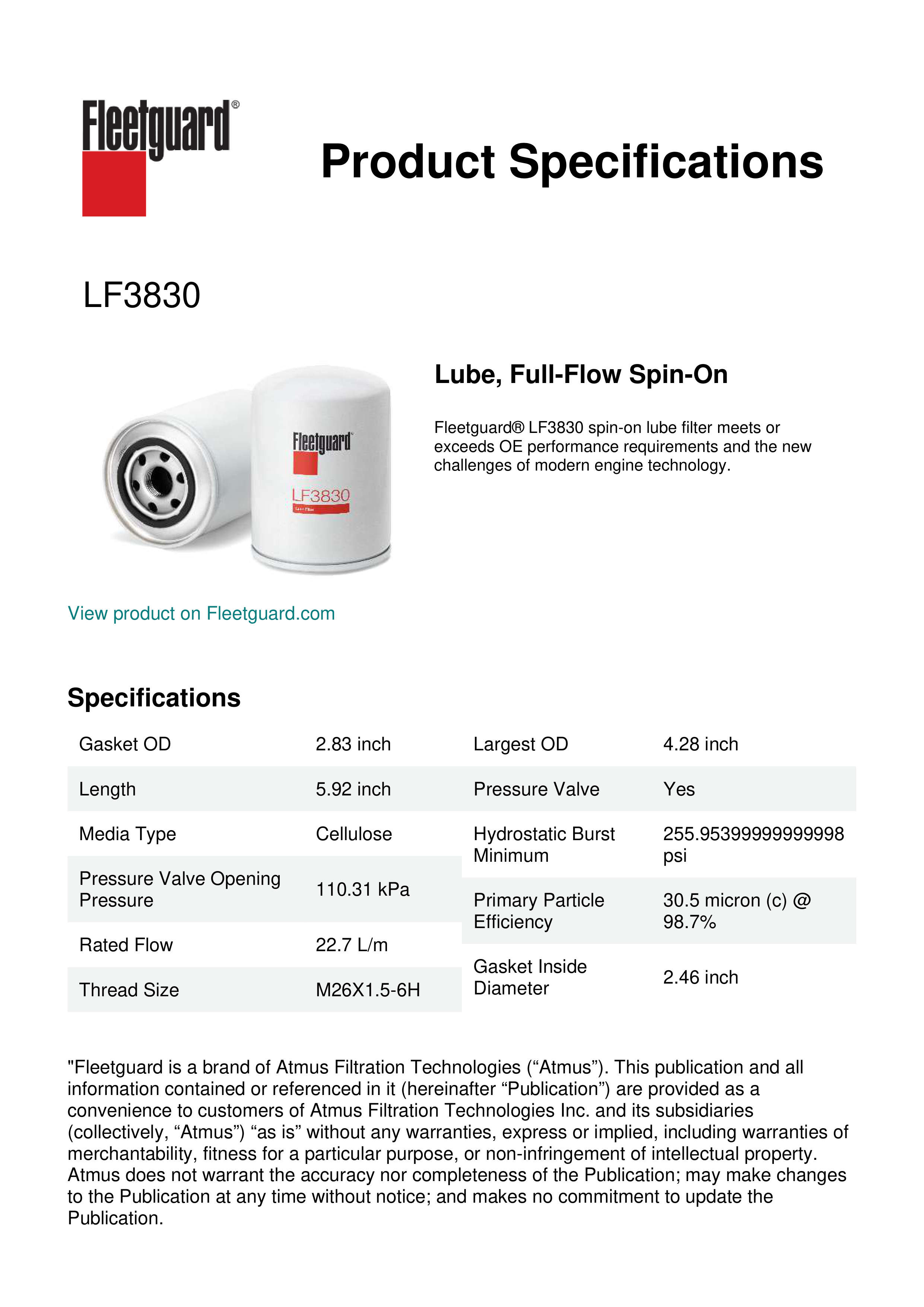 Fleetguard® LF3830 spin-on lube filter meets or exceeds OE performance requirements and the new challenges of modern engine technology.Specification