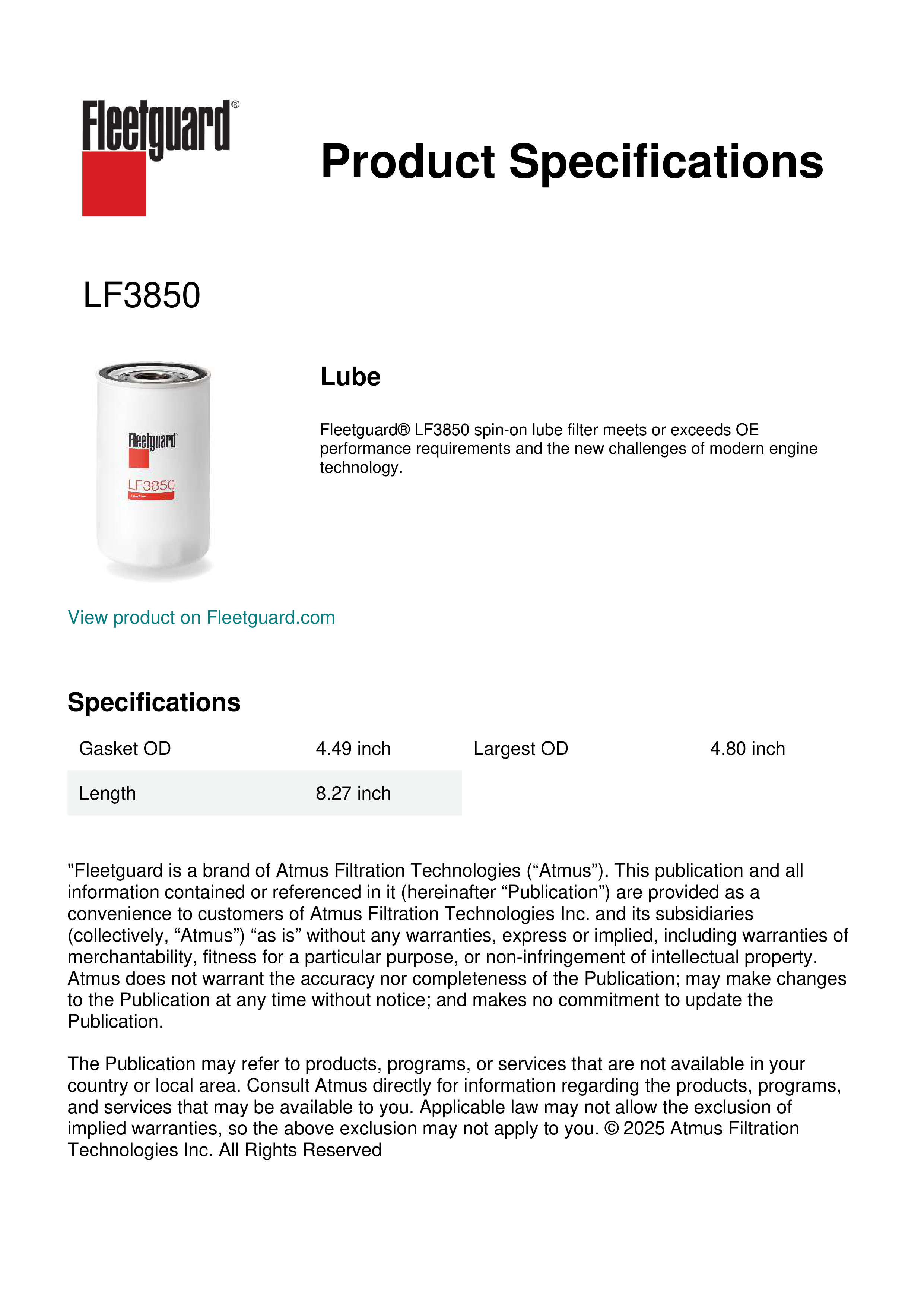 Fleetguard® LF3850 spin-on lube filter meets or exceeds OE performance requirements and the new challenges of modern engine technology.Specification