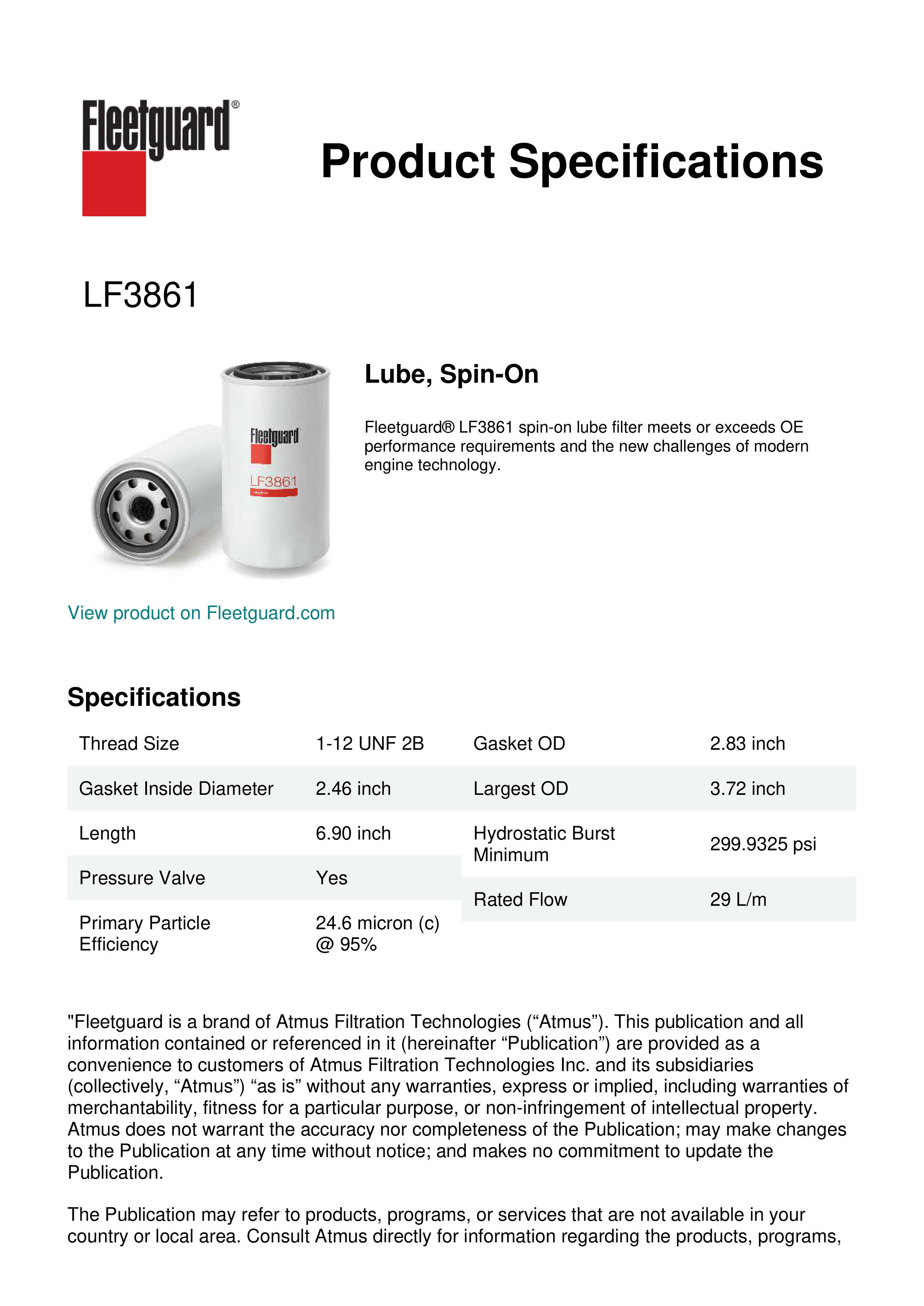 Fleetguard® LF3861 spin-on lube filter meets or exceeds OE performance requirements and the new challenges of modern engine technology.Specification