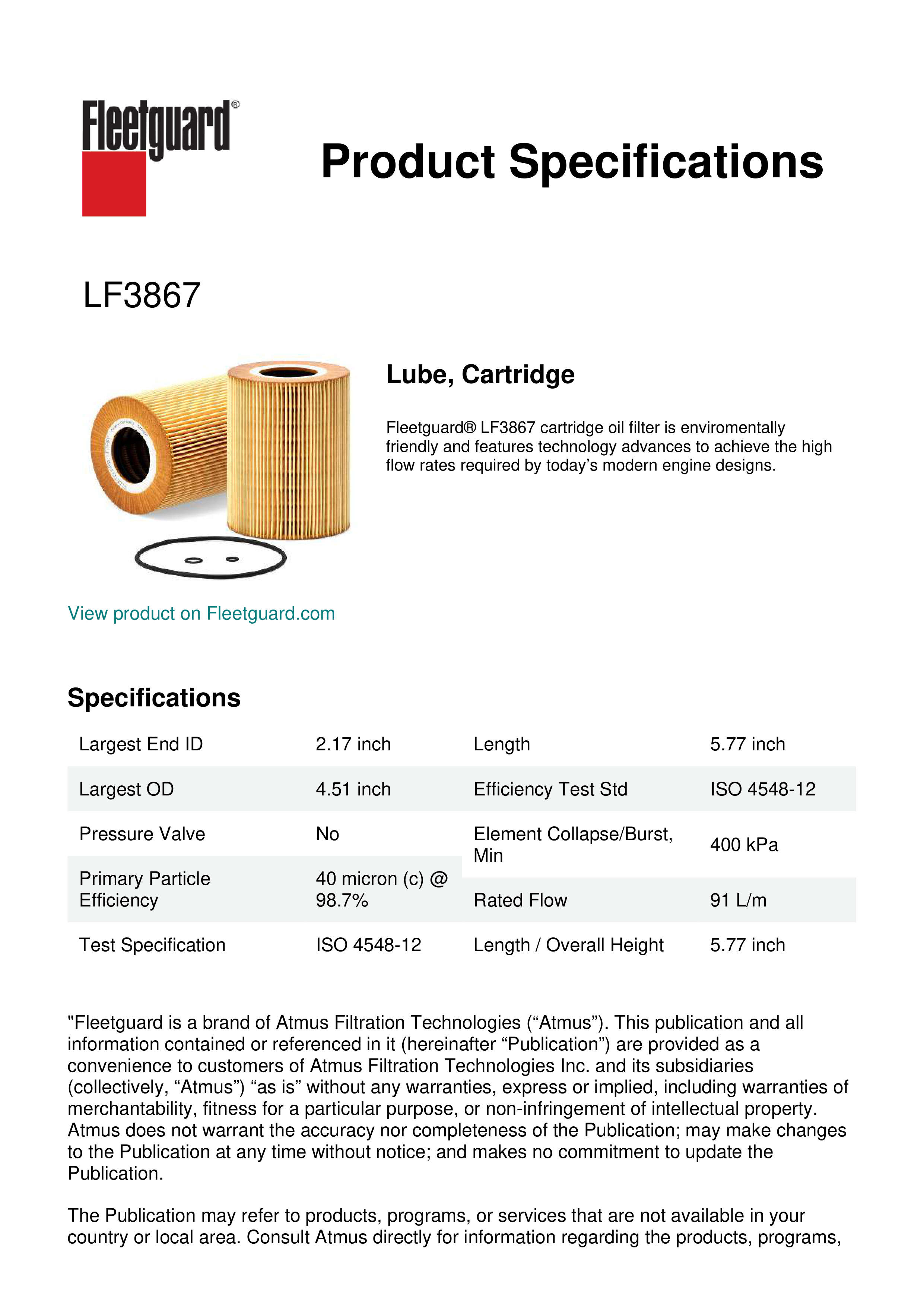 Fleetguard® LF3867 cartridge oil filter is enviromentally friendly and features technology advances to achieve the high flow rates required by today’s modern engine designs.Specification