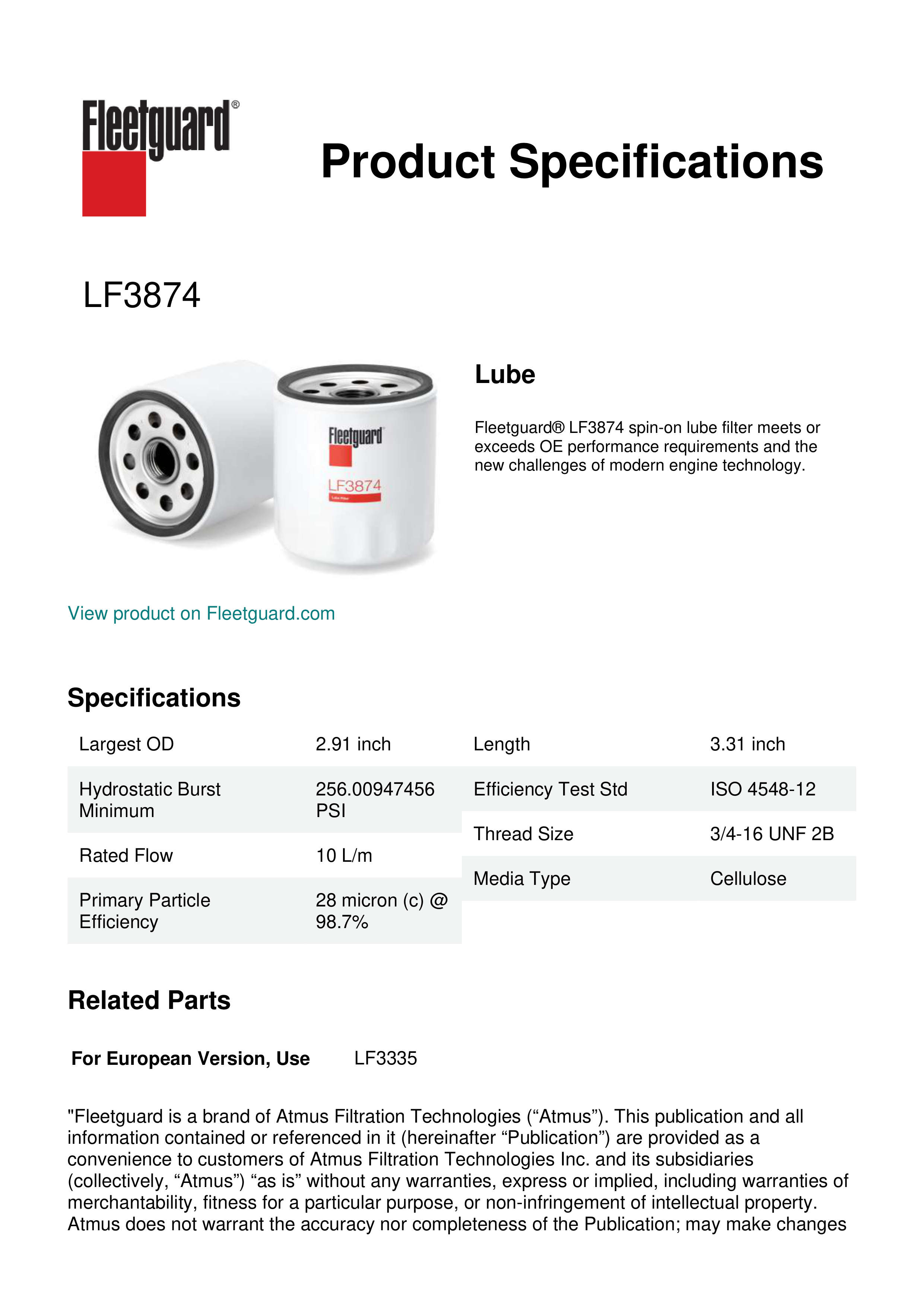 Fleetguard® LF3874 spin-on lube filter meets or exceeds OE performance requirements and the new challenges of modern engine technology.Specification