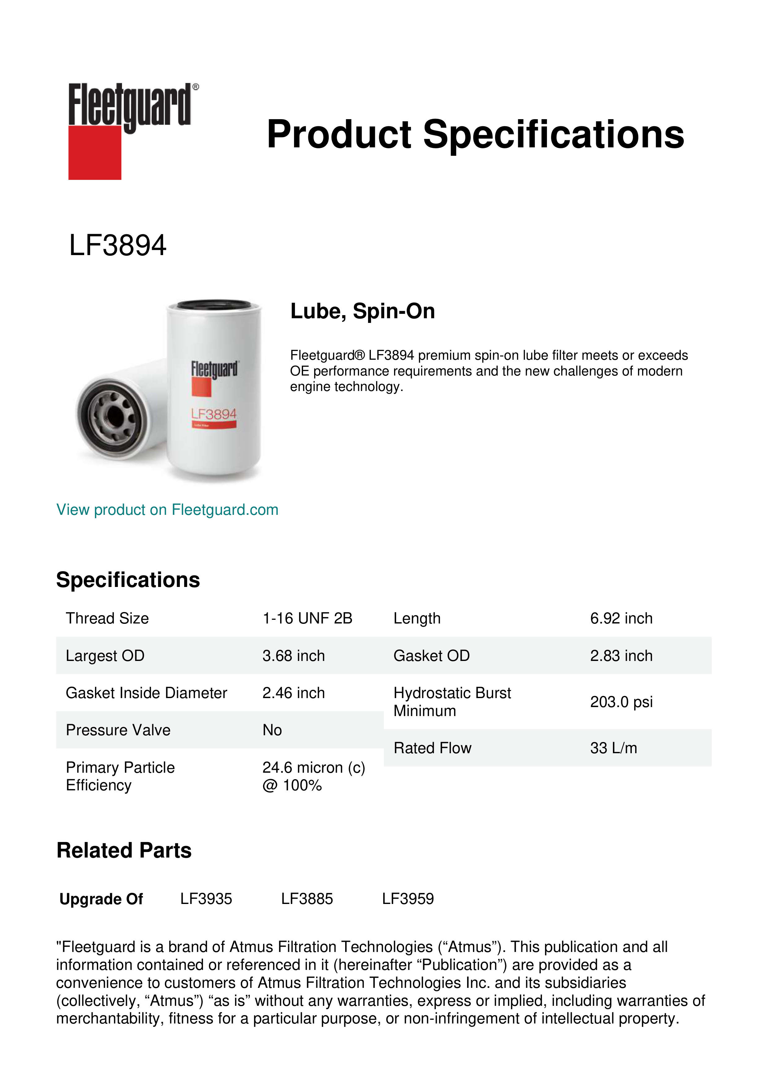 Fleetguard® LF3894 premium spin-on lube filter meets or exceeds OE performance requirements and the new challenges of modern engine technology.Specification