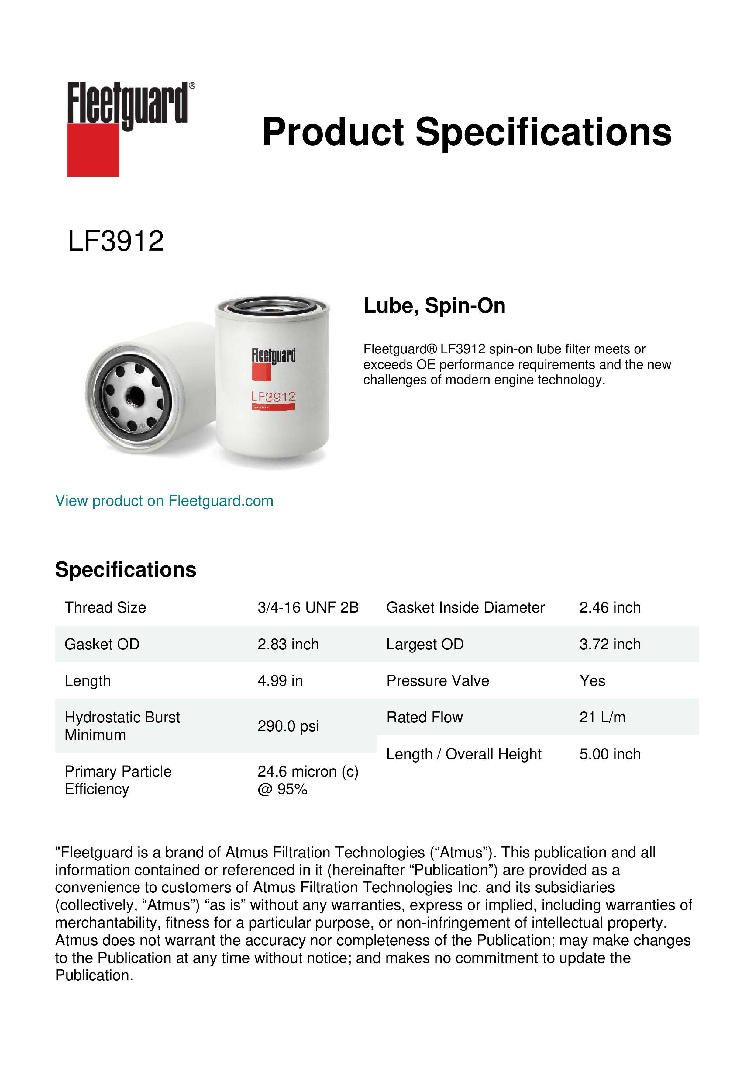 Fleetguard® LF3912 spin-on lube filter meets or exceeds OE performance requirements and the new challenges of modern engine technology.Specification