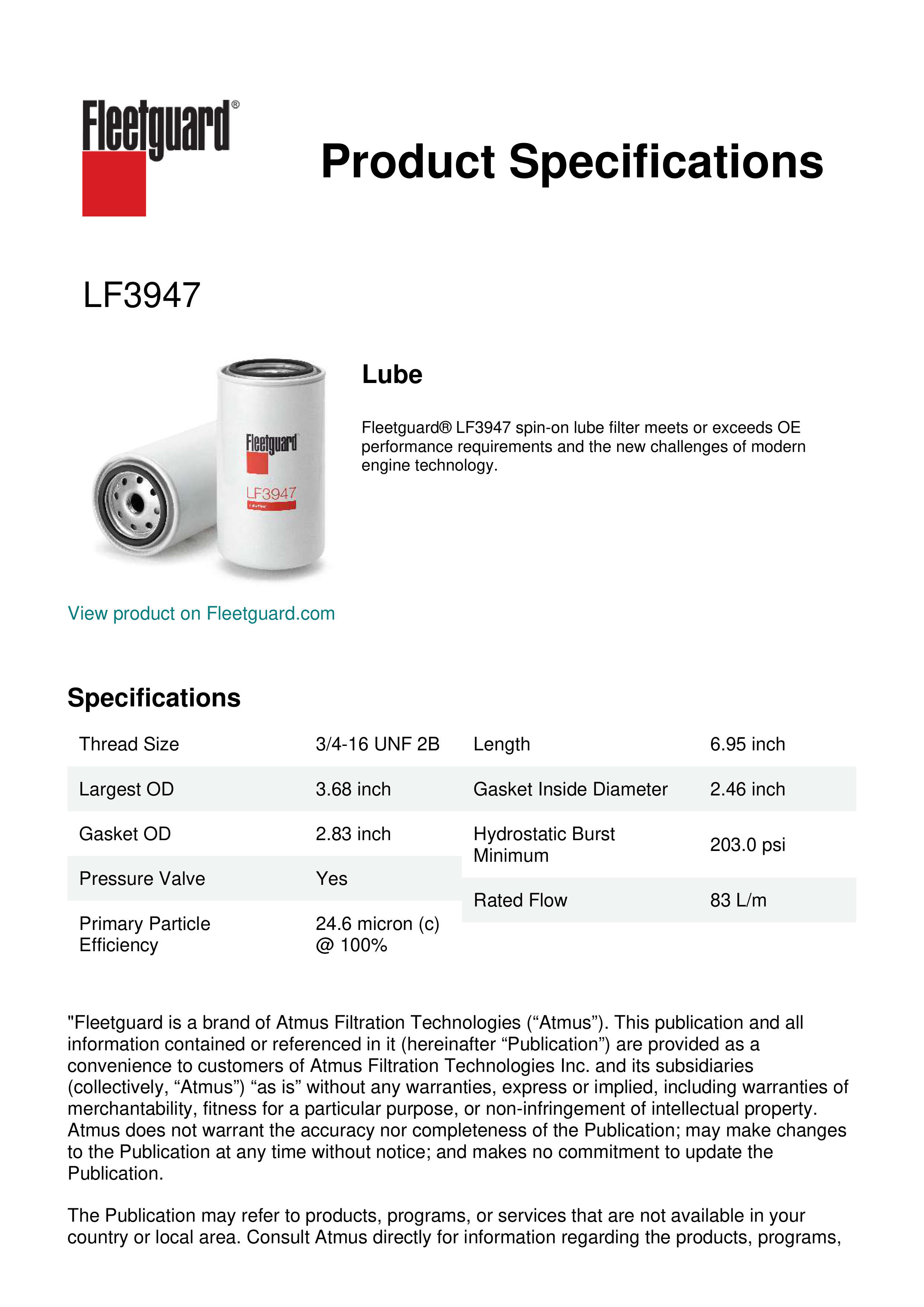Fleetguard® LF3947 spin-on lube filter meets or exceeds OE performance requirements and the new challenges of modern engine technology.Specification
